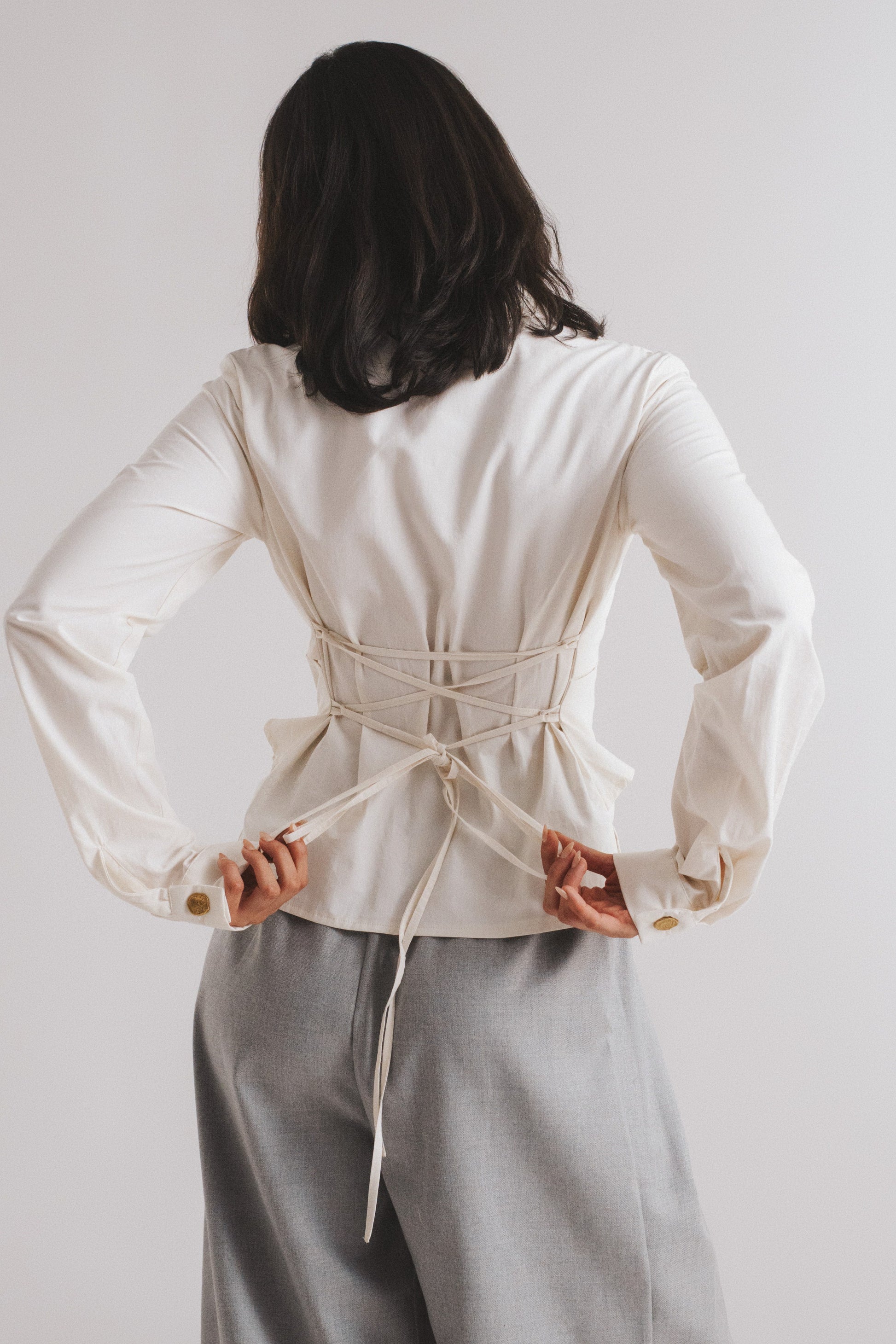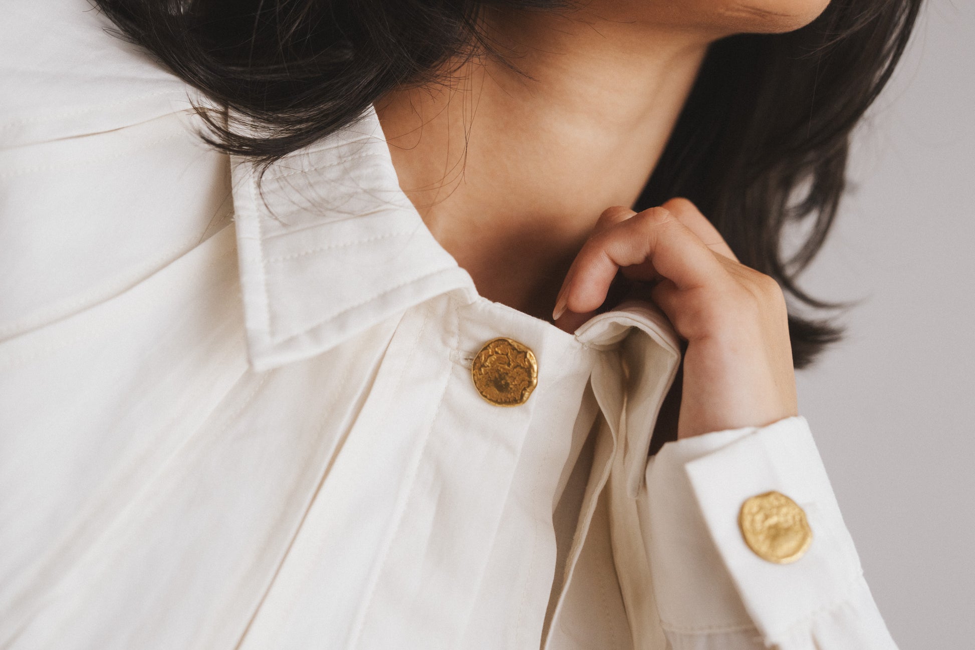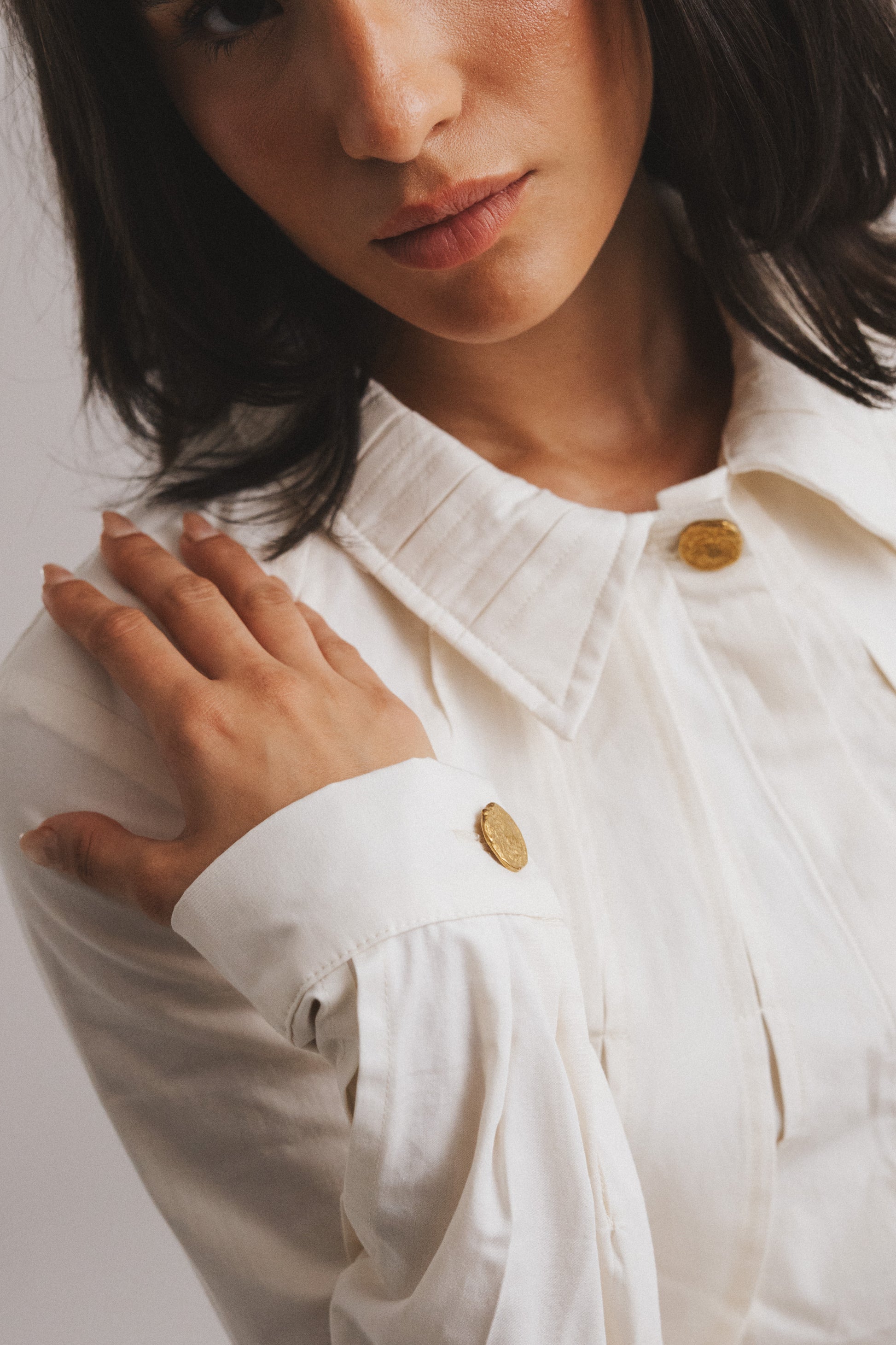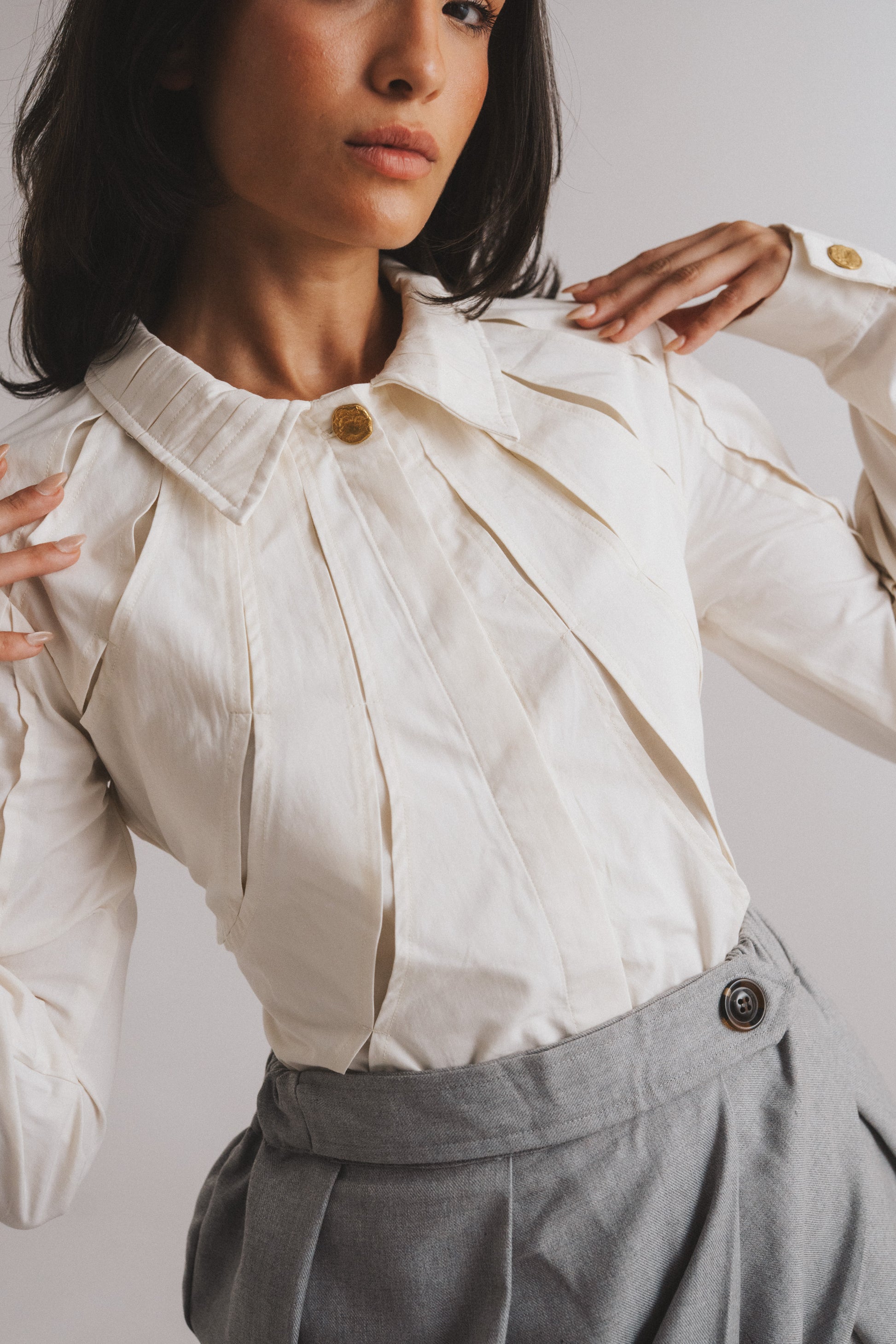 Delicate charm defines this creme poplin chemise, with hidden buttons and shredded pleats adding subtle depth. Rock-shaped brass buttons adorn the collar and cuffs, injecting a touch of rugged elegance. A discreet 1cm back belt cinches the waist, refining the silhouette.