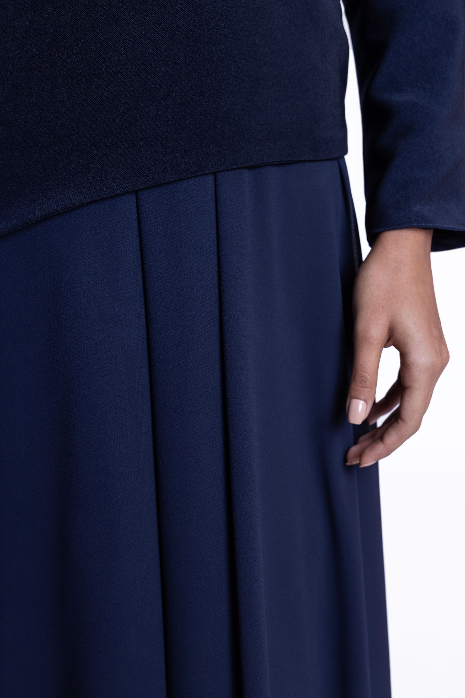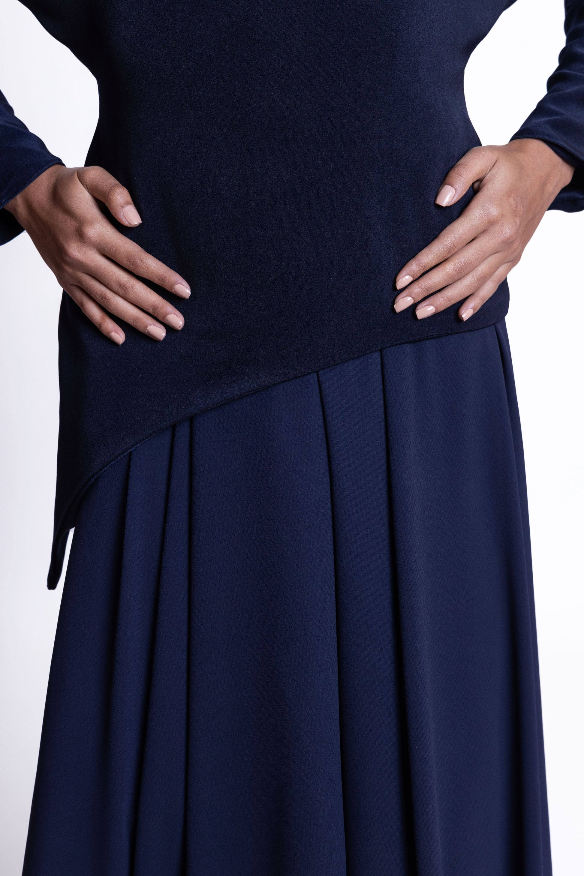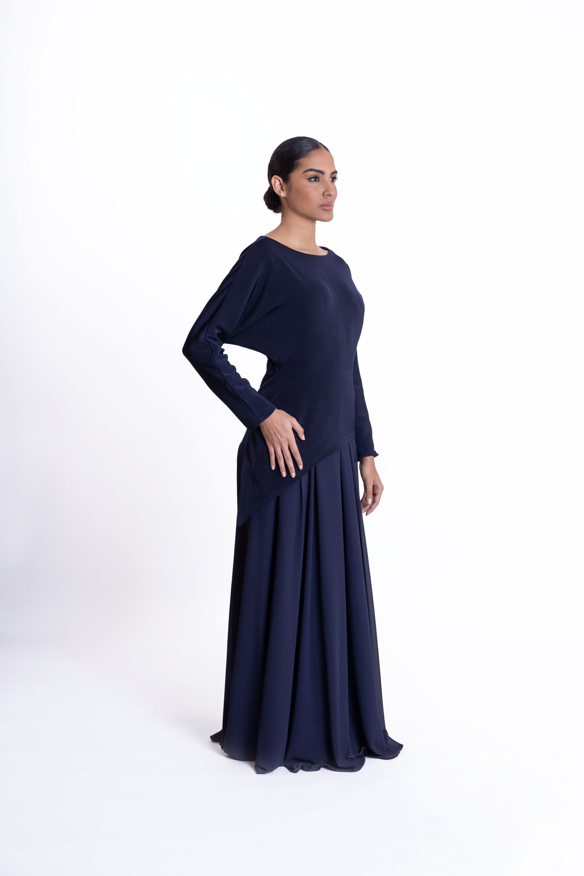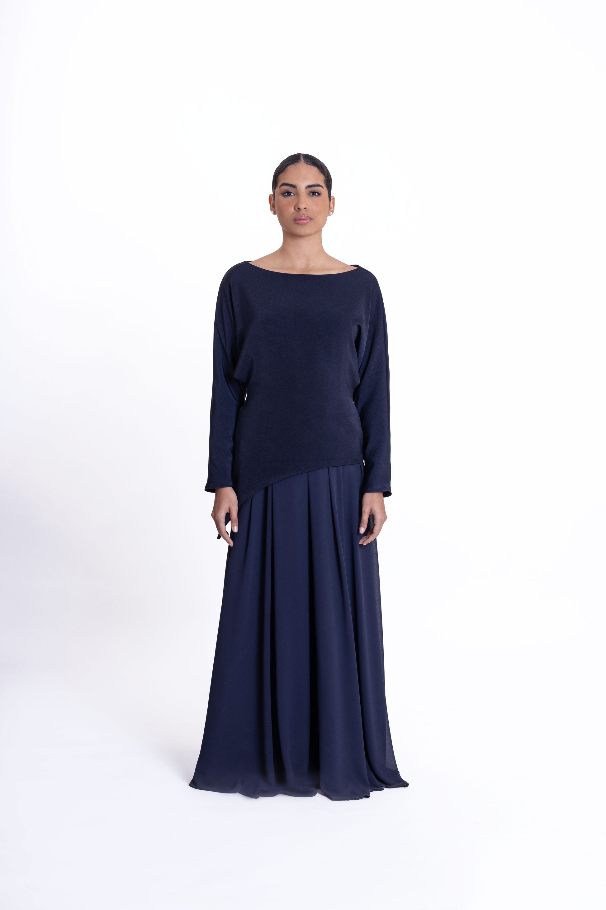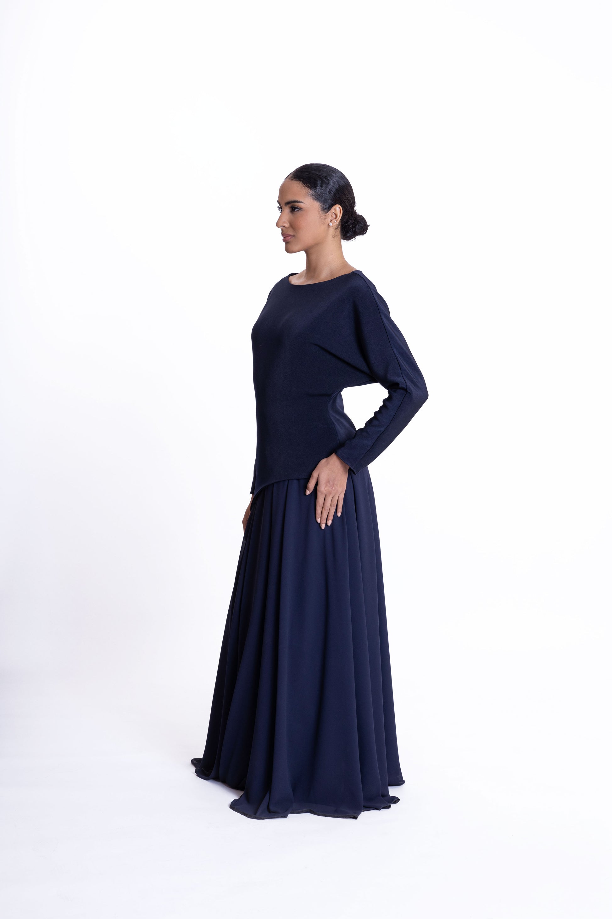 The raglan long sleeve maxi dress with Sabrina neckline is truly exquisite. Clean curvy lines take center stage in this design, lending a classy structural shape to this shapely upper part in crepe stretchy fabric that makes it as if it stands a part from the lower flowy chiffon skirt. A mix of fabrics to make an eye-catching statement. Dress length is 150.