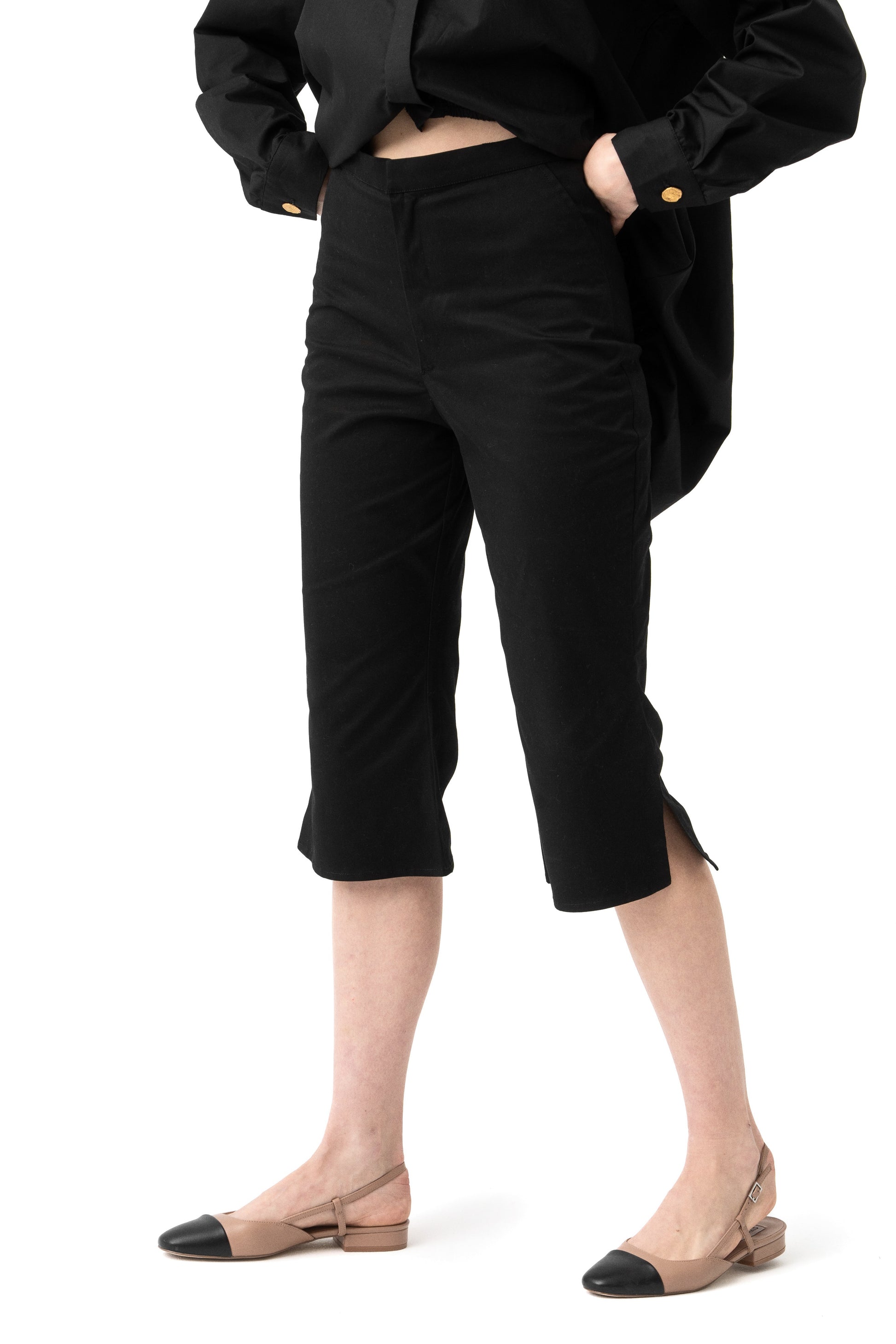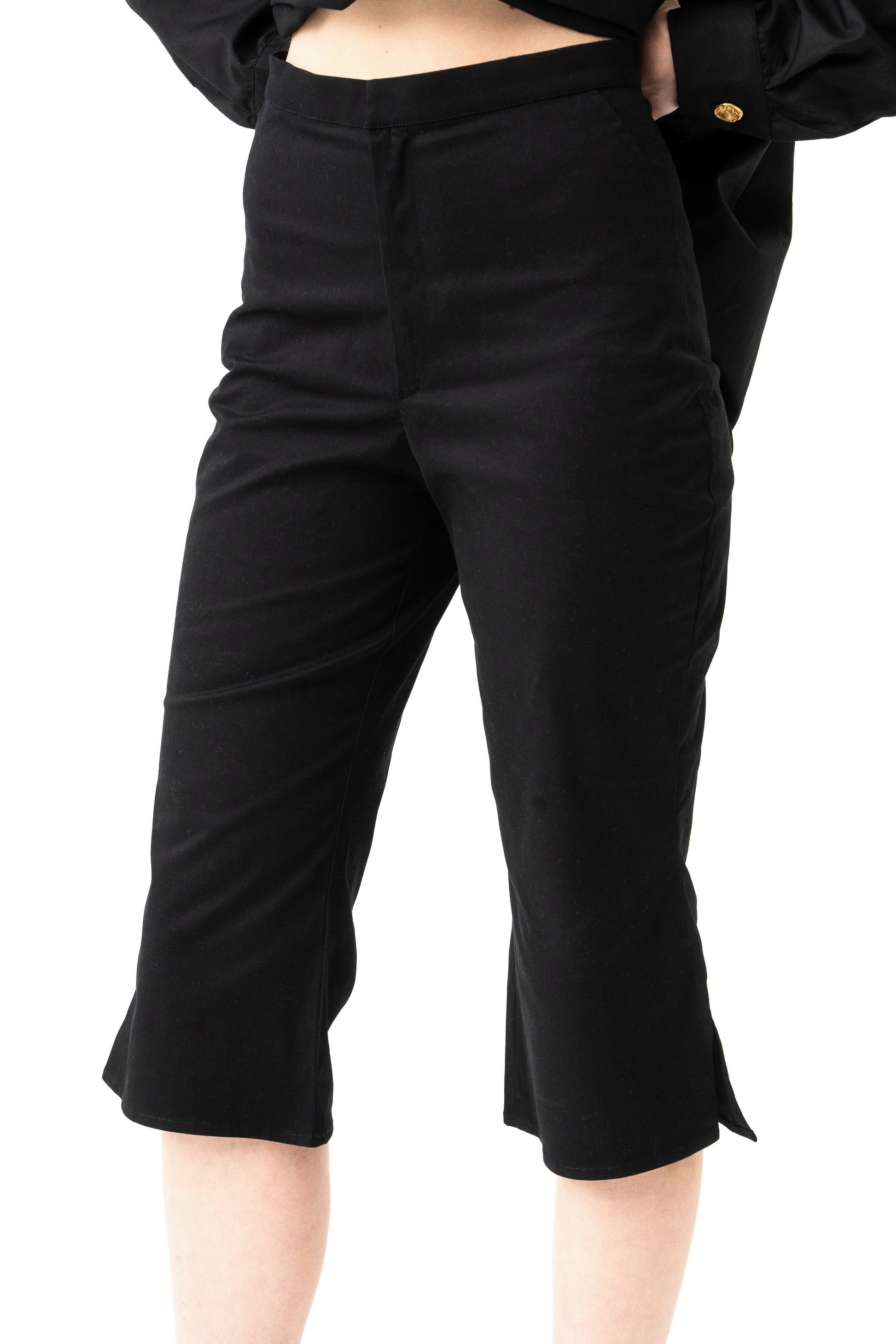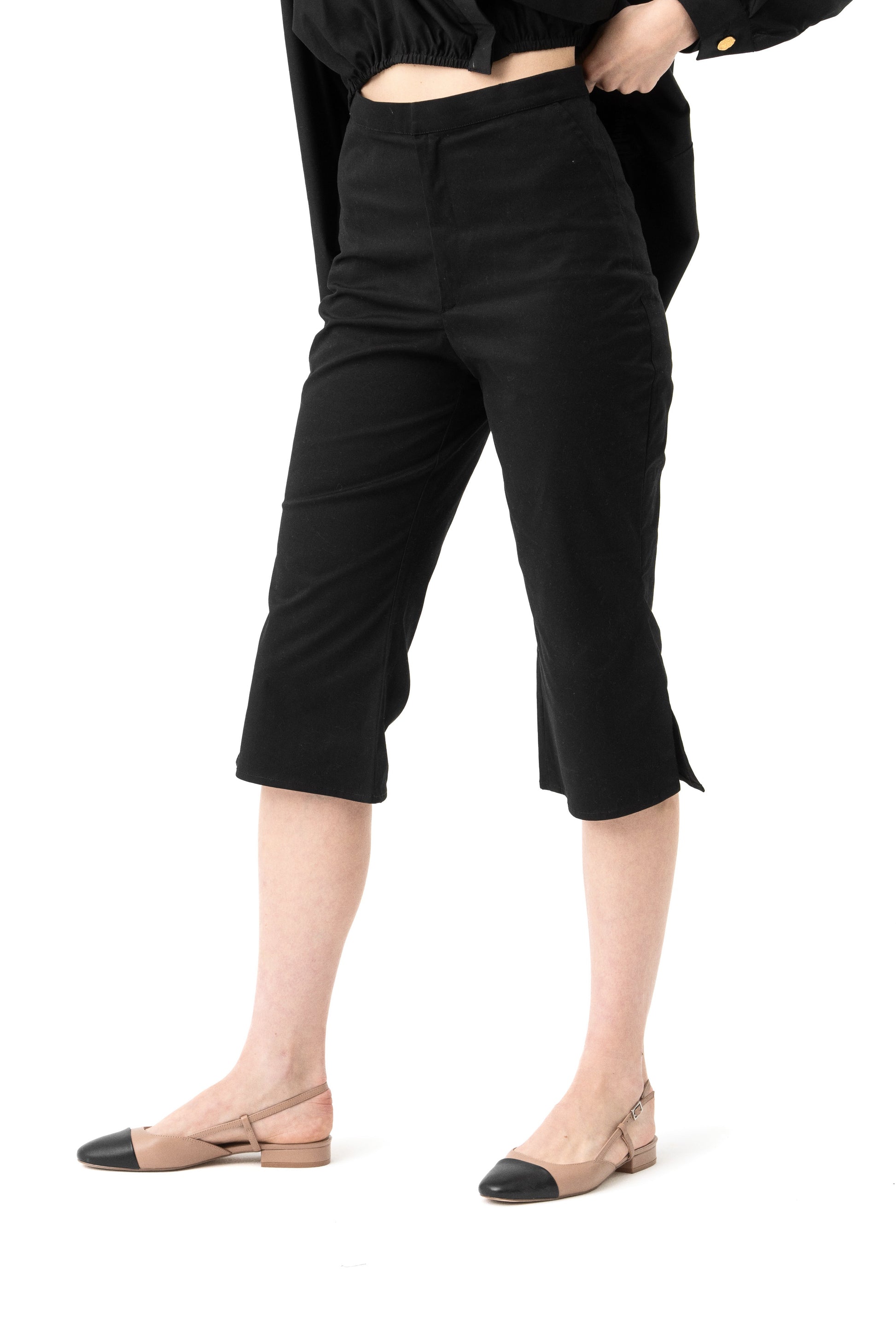 The flared lycra gabardine capri pants are a chic and versatile piece, perfect for elevating your wardrobe. These high-waisted pants feature a flattering mid-calf length and a stylish flared hem shape. The front zip and hook closure ensure a sleek and secure fit, while the stretch fabrication offers comfort and ease of movement. Unlined for a lightweight feel, these pants pair perfectly with Elai overlapped chemise, creating a sophisticated and effortlessly stylish ensemble.