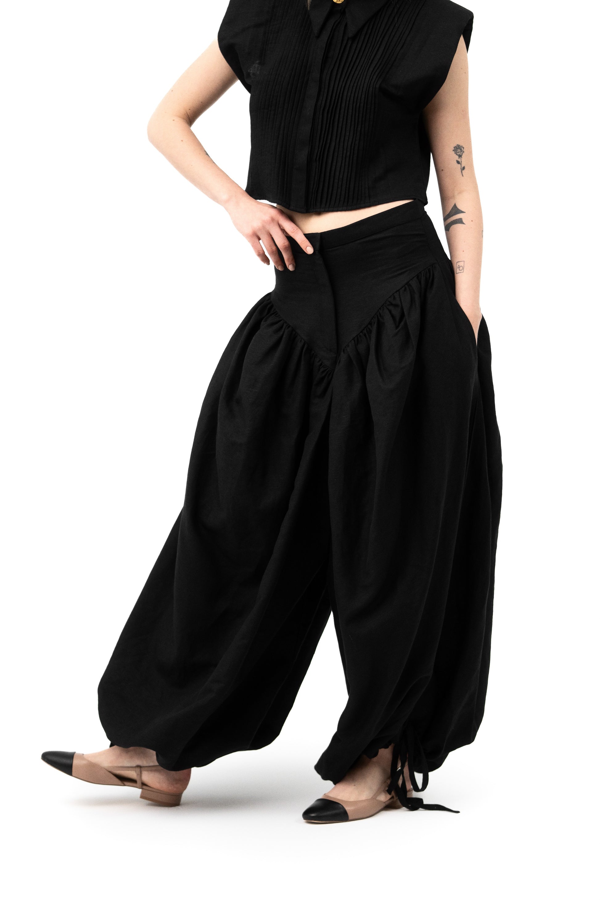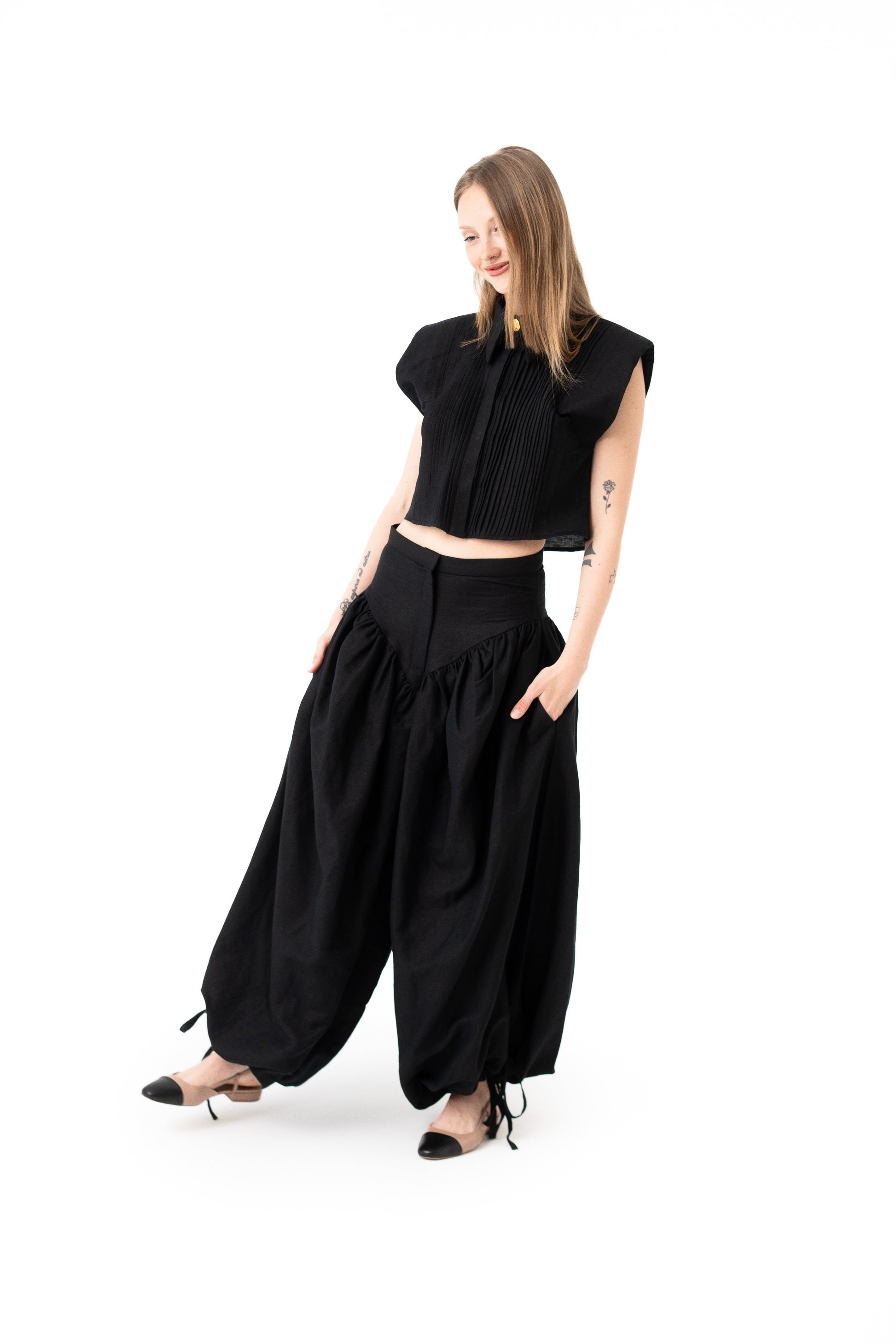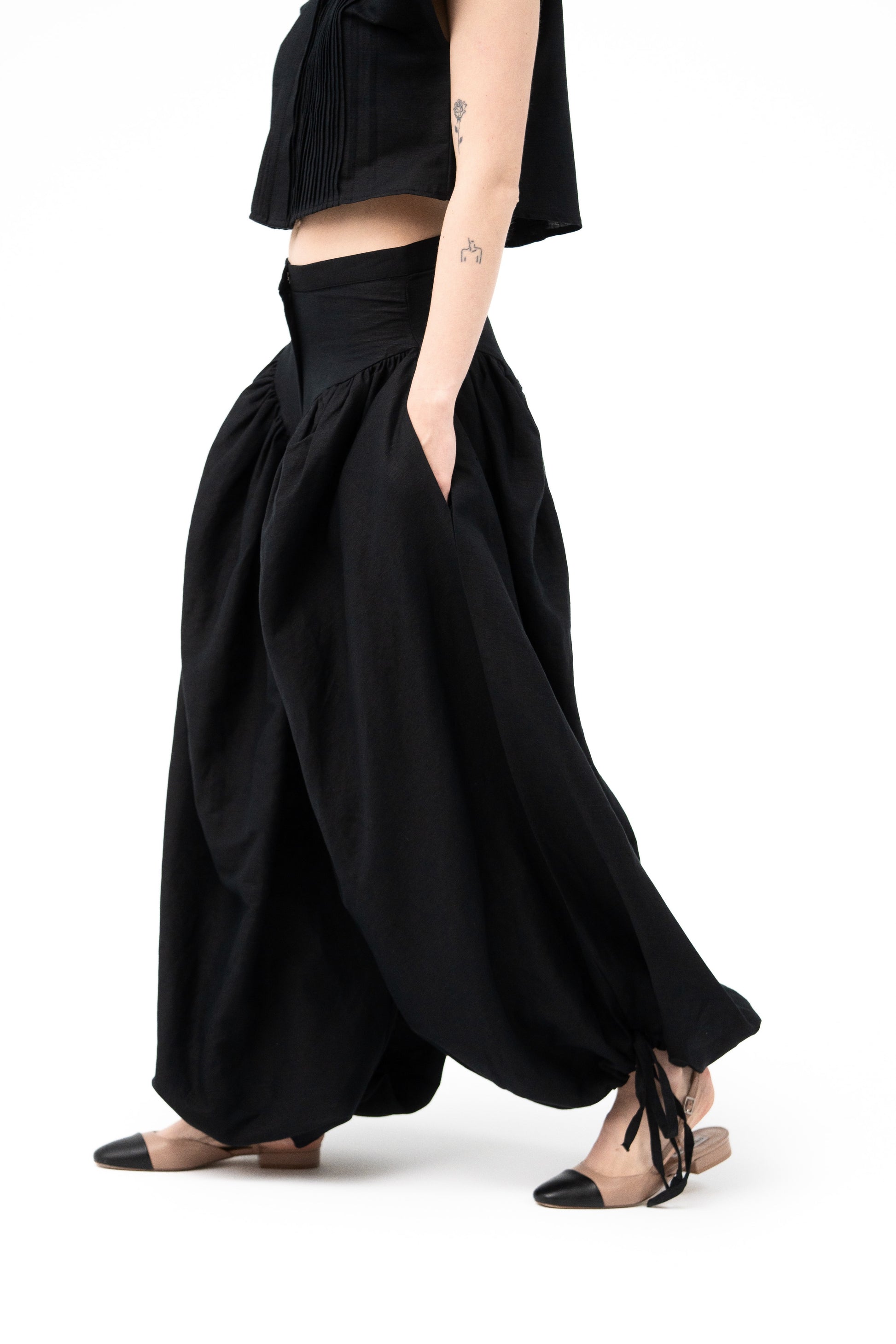 The high waist provides a flattering silhouette, accentuating the waist and elongating the legs. In Balloon Shape with relaxed, voluminous fit around the hips and thighs tapers down toward the ankles, creating a stylish balloon effect that is both comfortable and fashionable. Functional pockets add practicality and enhance the casual vibe of the pants. Controlling Tapes These adjustable tapes at the ends allow you to customize the fit around the ankles, giving you options to create a tapered look or maintain a wider leg.