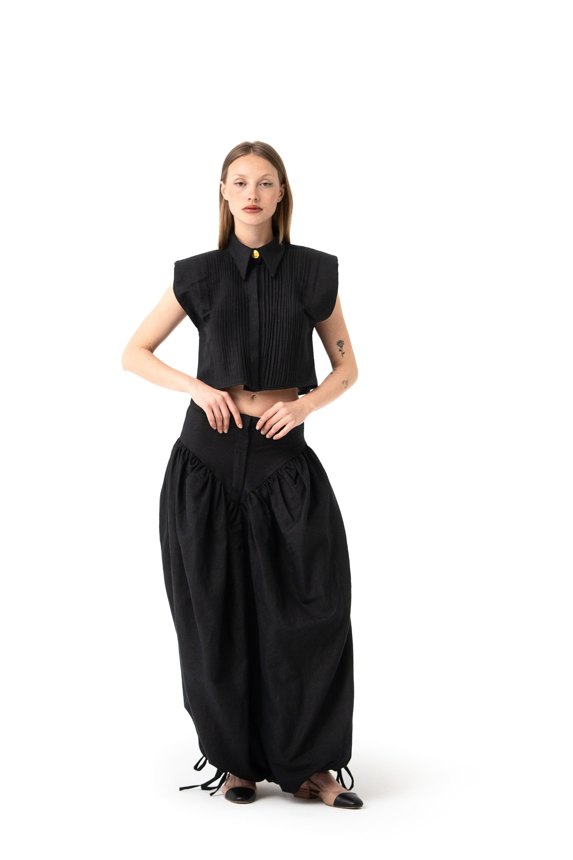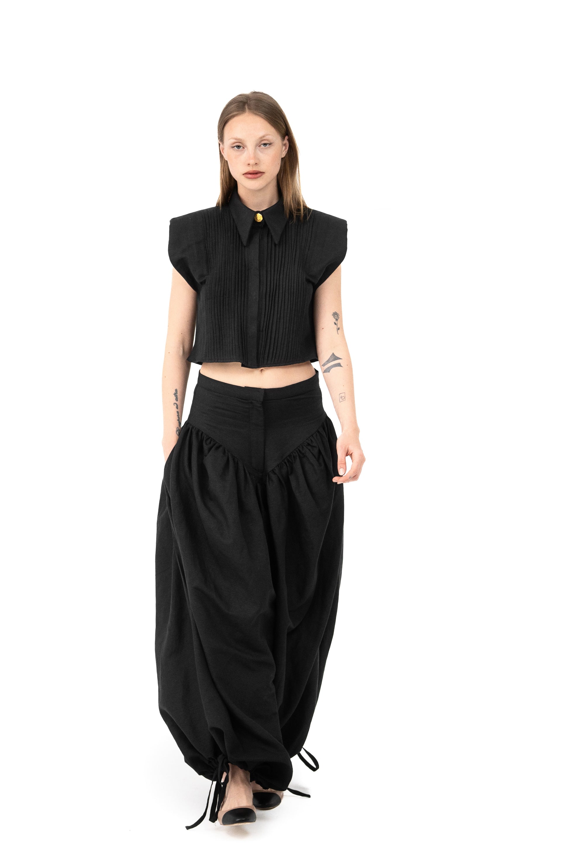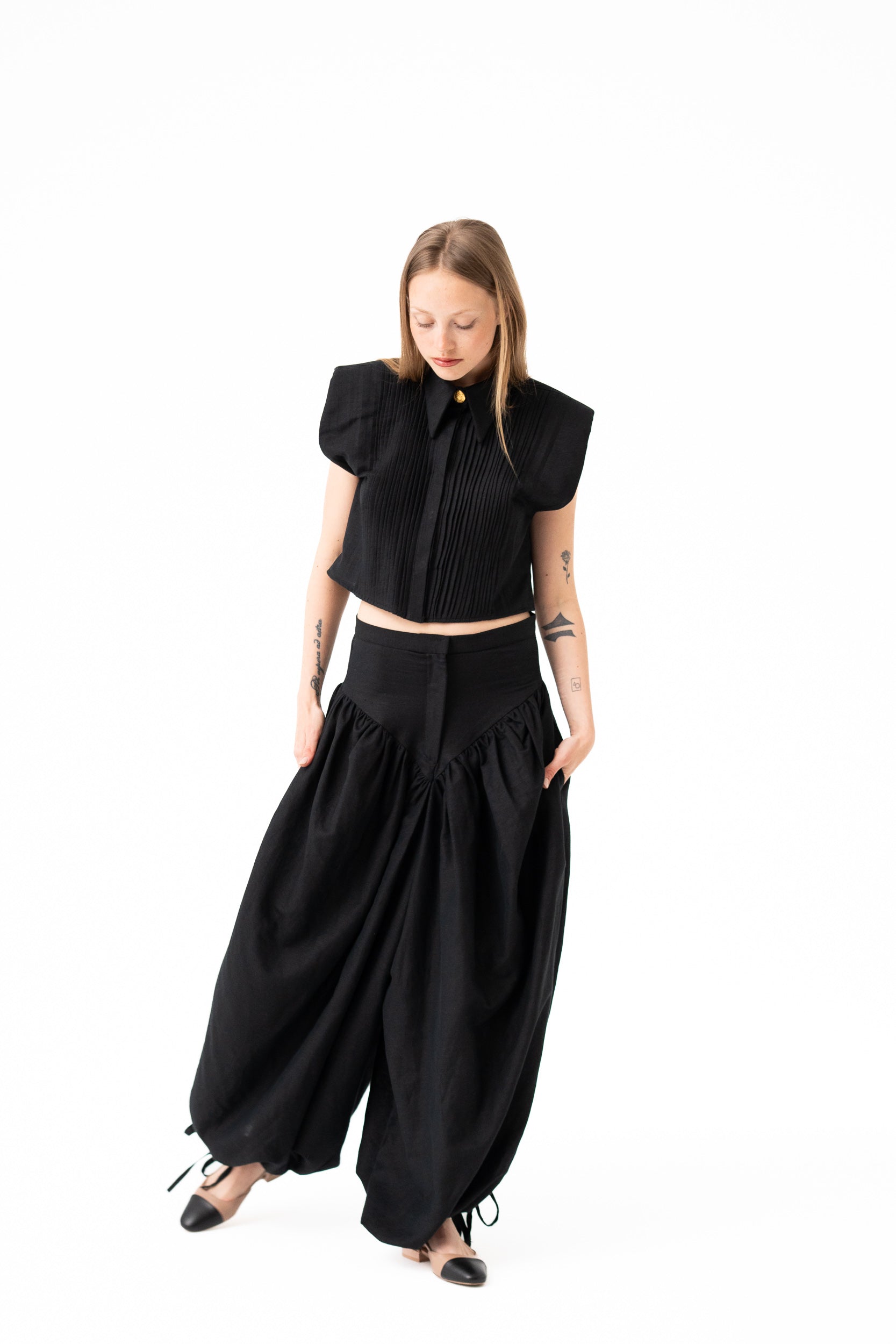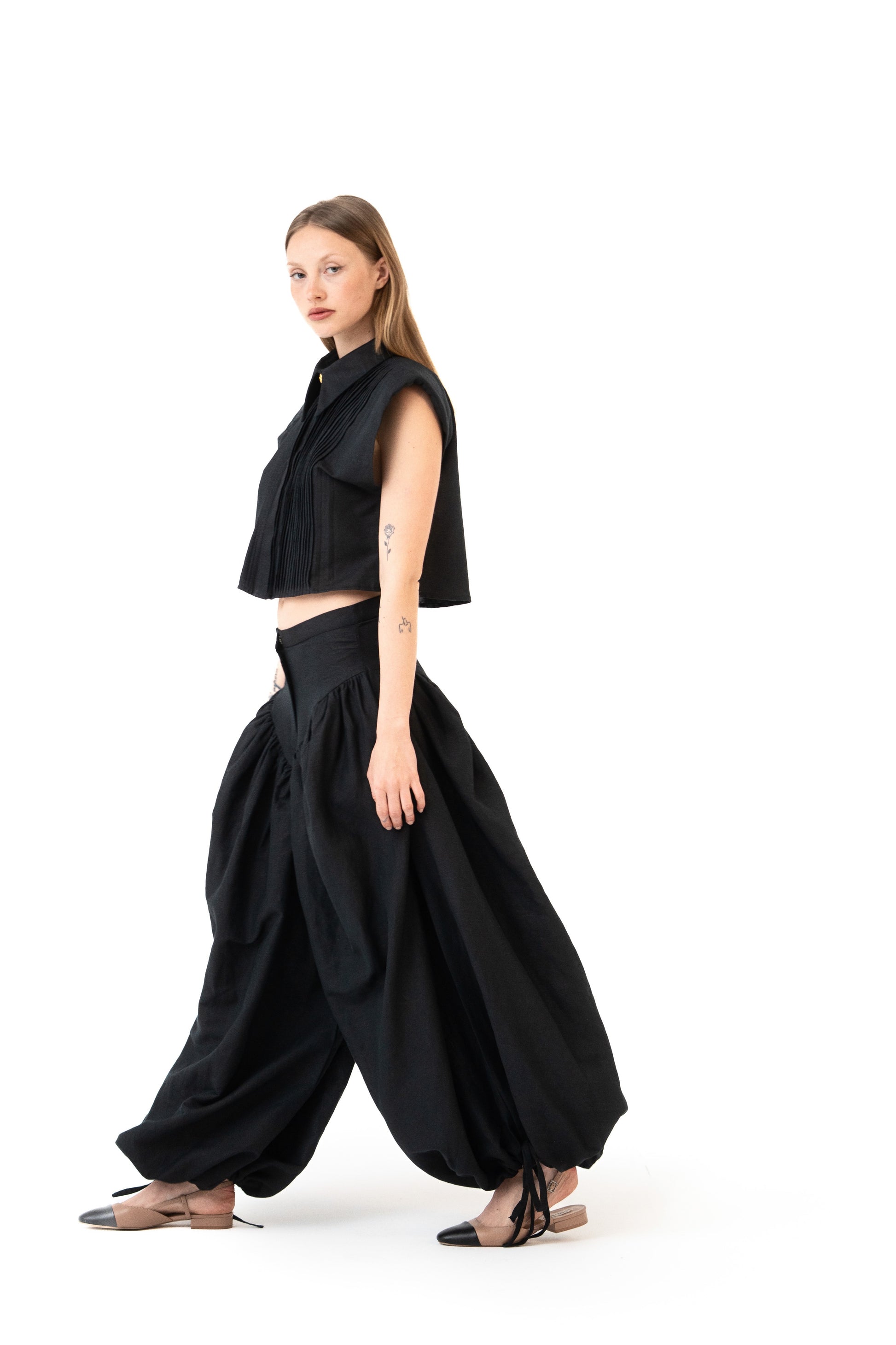 The high waist provides a flattering silhouette, accentuating the waist and elongating the legs. In Balloon Shape with relaxed, voluminous fit around the hips and thighs tapers down toward the ankles, creating a stylish balloon effect that is both comfortable and fashionable. Functional pockets add practicality and enhance the casual vibe of the pants. Controlling Tapes These adjustable tapes at the ends allow you to customize the fit around the ankles, giving you options to create a tapered look or maintain a wider leg.
