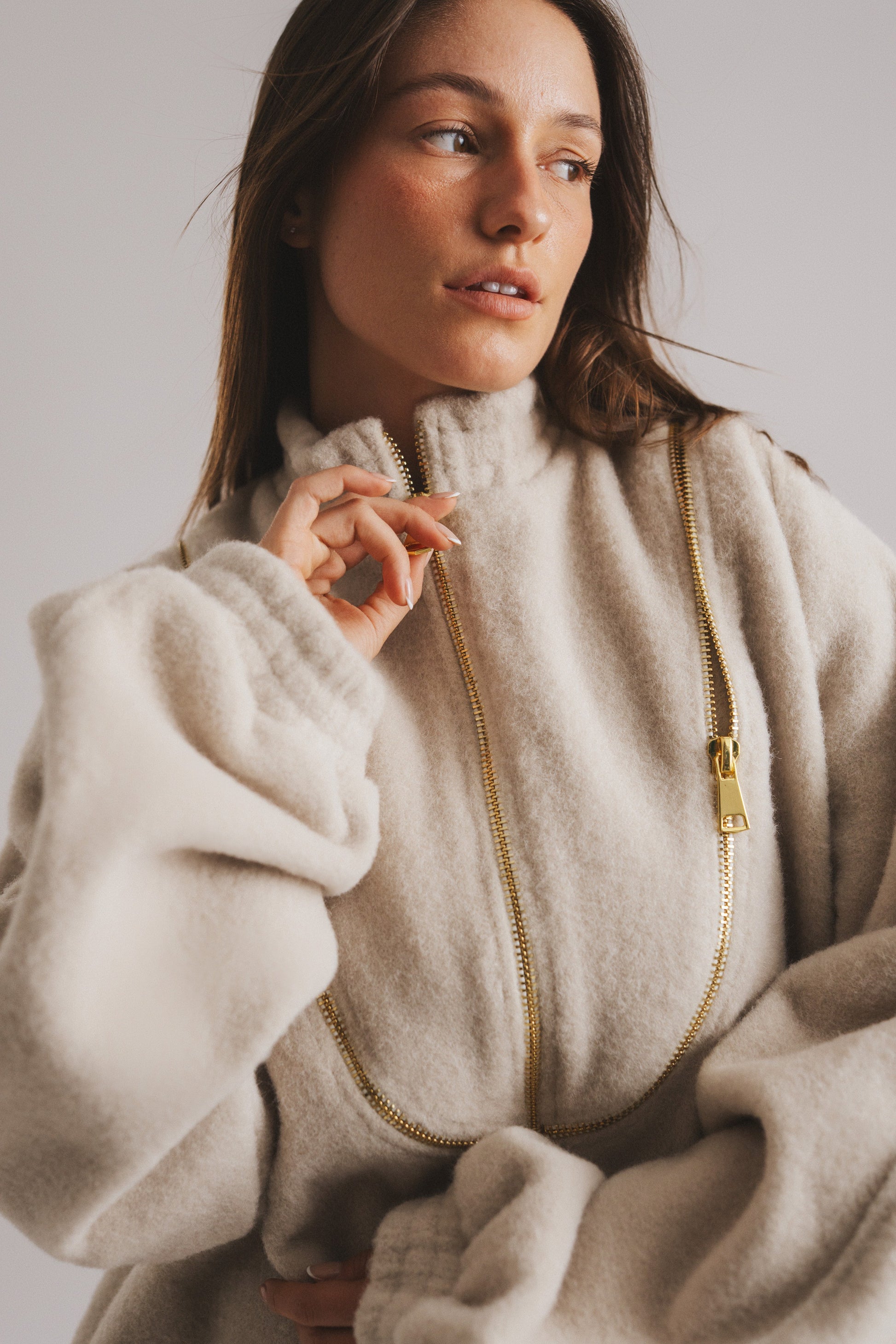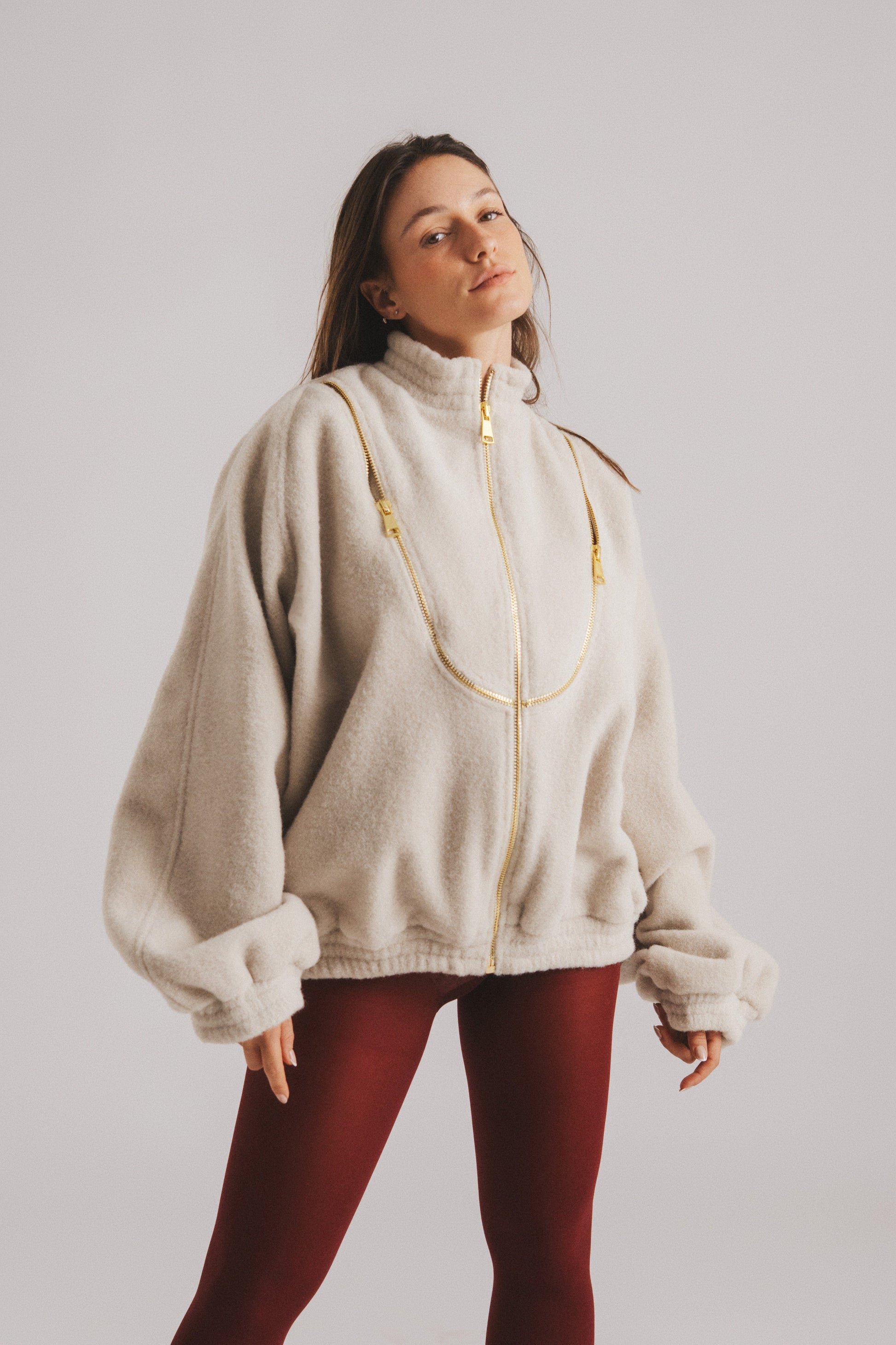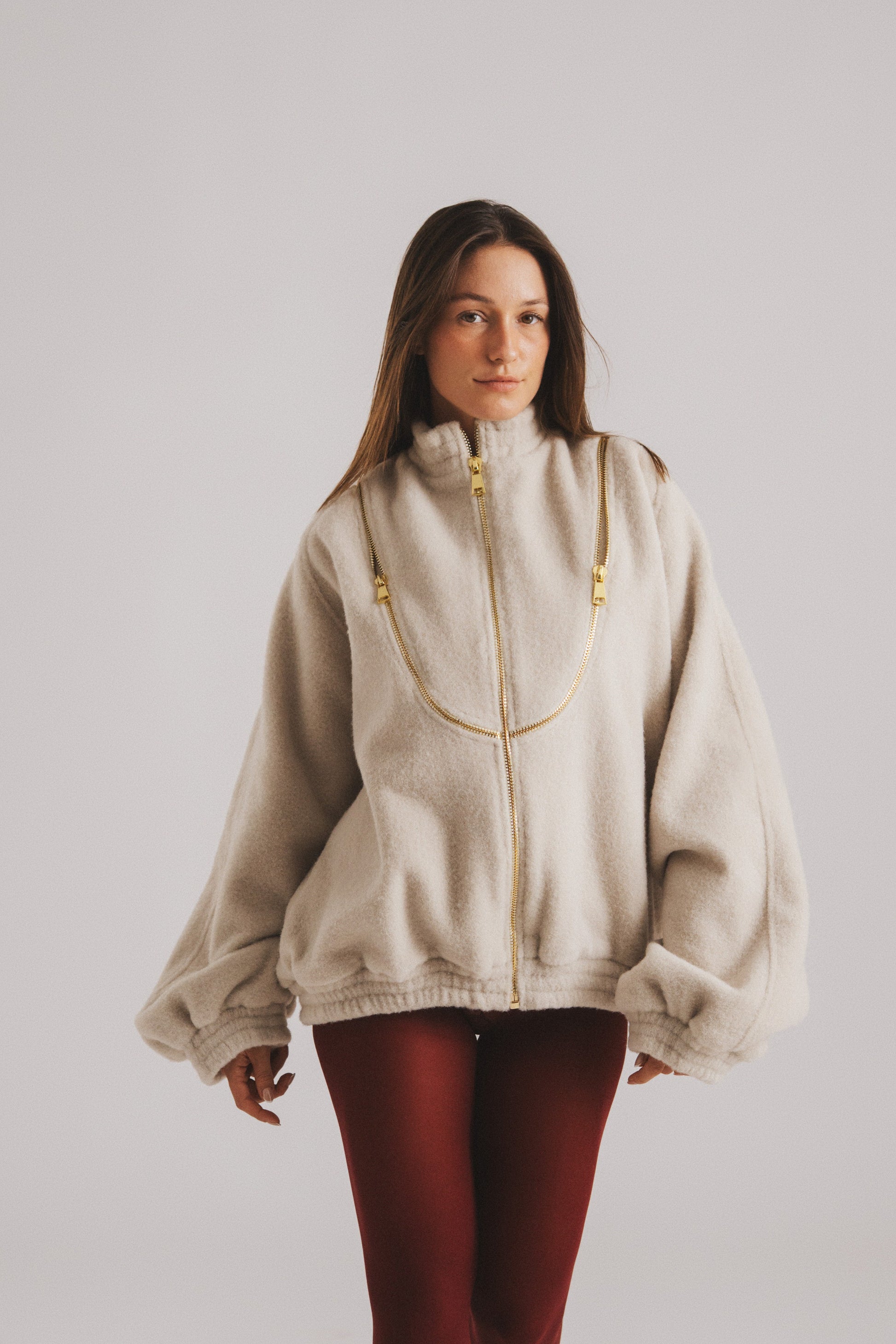 This free size striking creme jacket features a bold design with a closure front brass zipper and two intersecting brass zippers starting from the shoulders, These three brass zippers create a striking intersection, adding an edgy touch. Crafted from luxurious creme hairy felt, the jacket boasts elastic cuffs, collar, and hem for a comfortable fit.