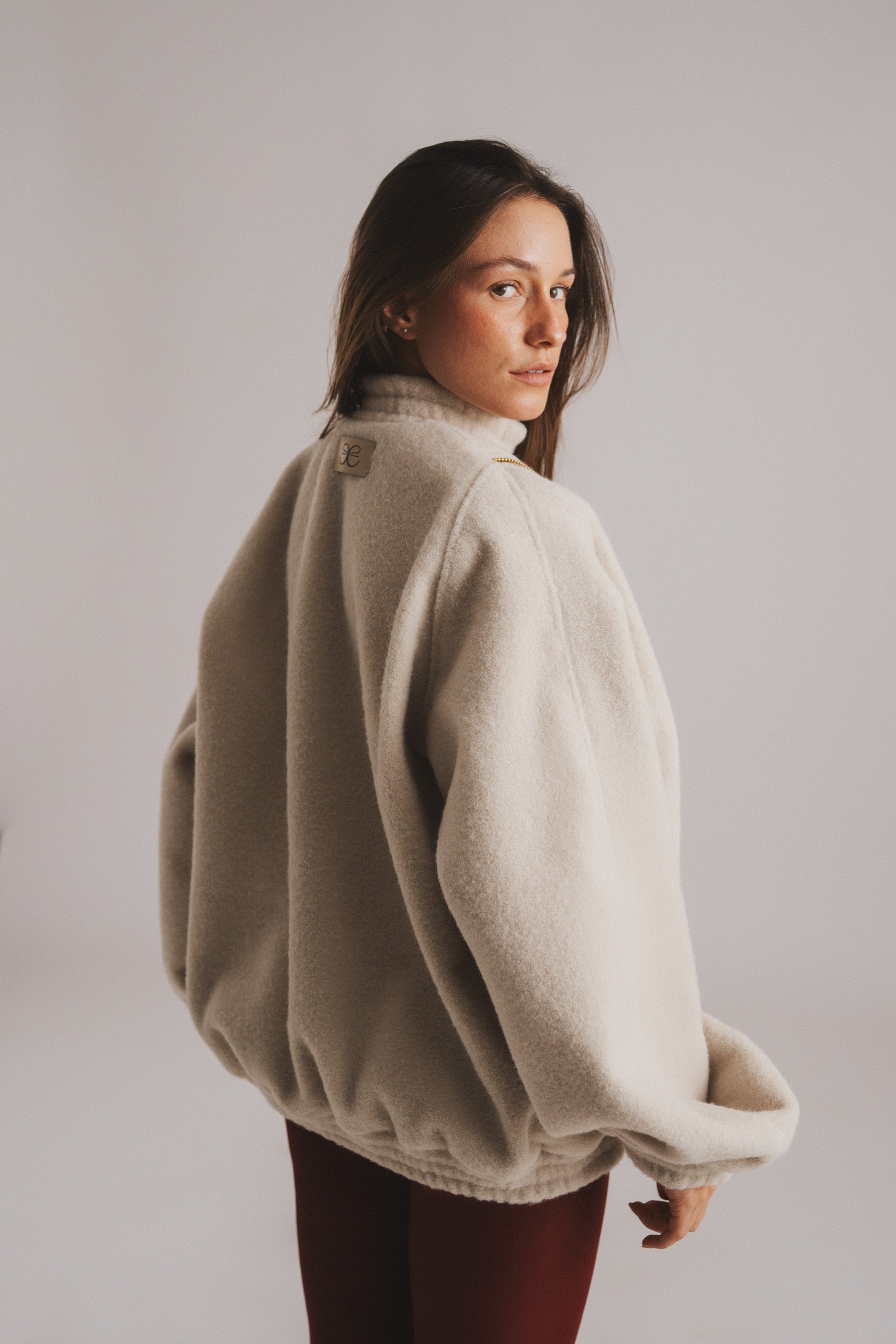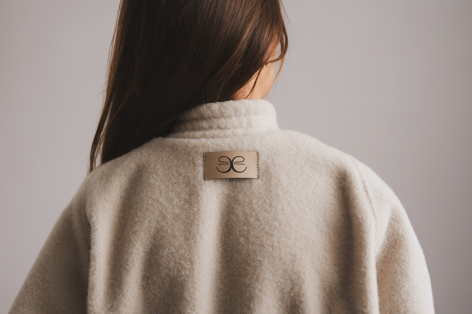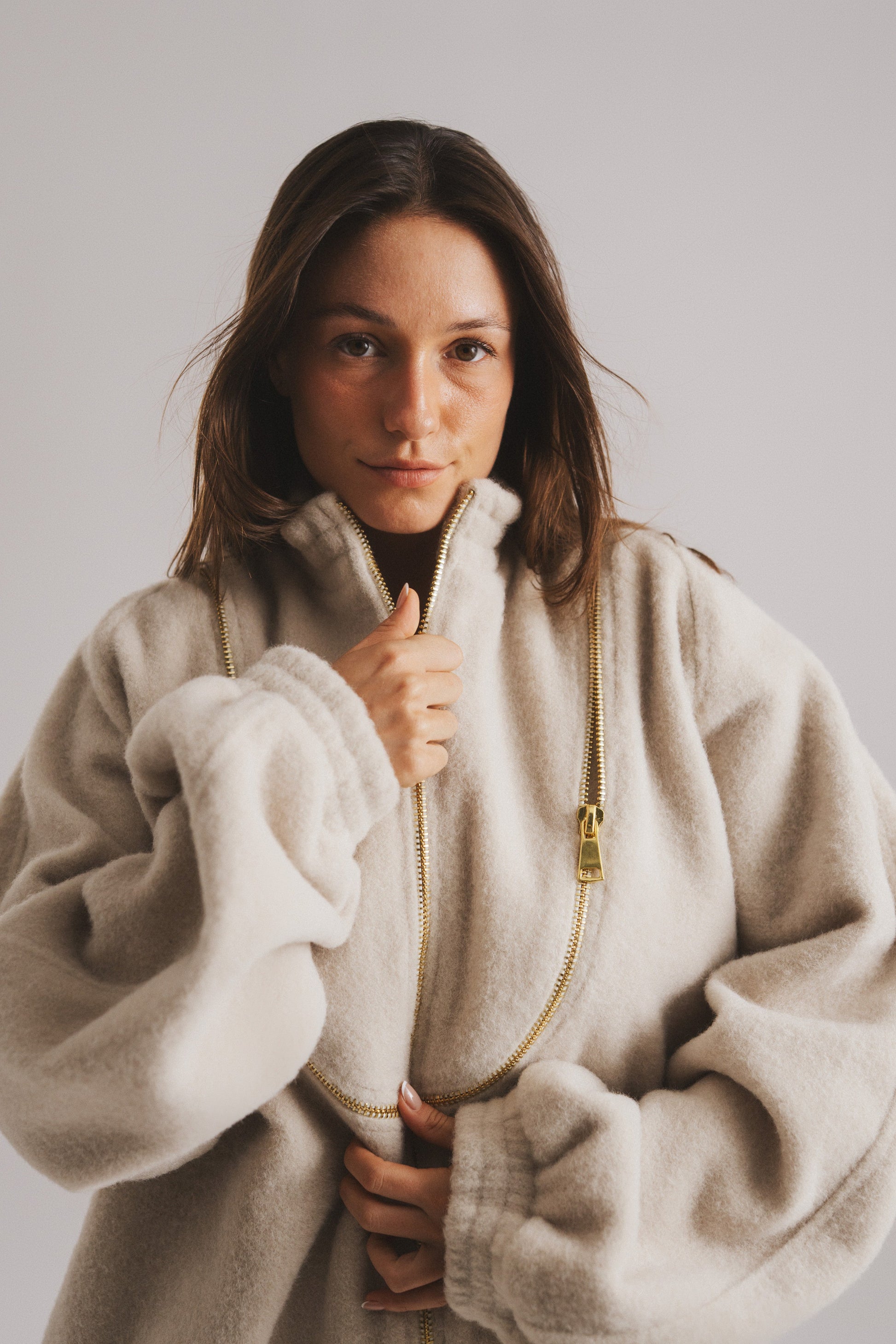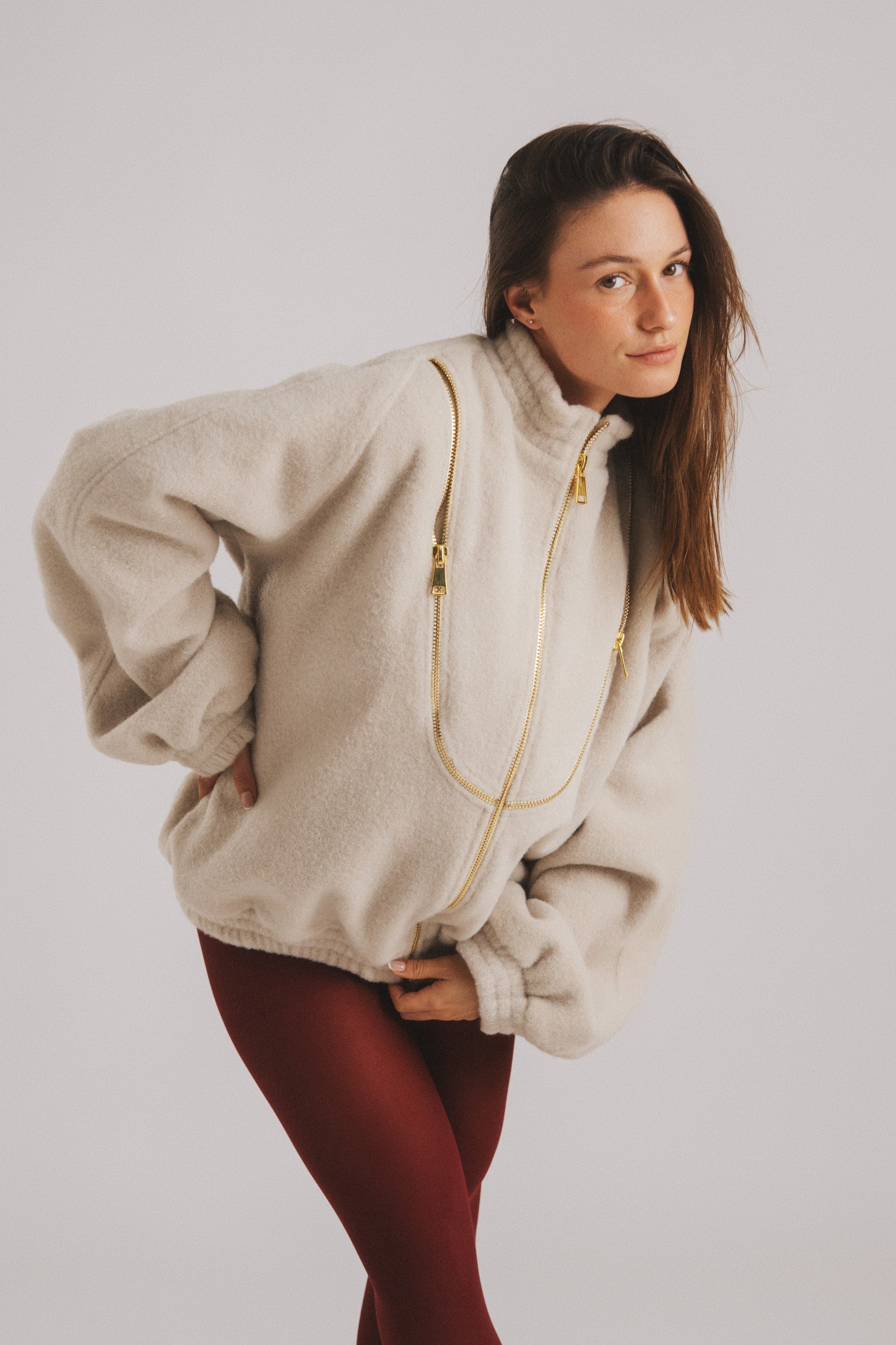 This free size striking creme jacket features a bold design with a closure front brass zipper and two intersecting brass zippers starting from the shoulders, These three brass zippers create a striking intersection, adding an edgy touch. Crafted from luxurious creme hairy felt, the jacket boasts elastic cuffs, collar, and hem for a comfortable fit.