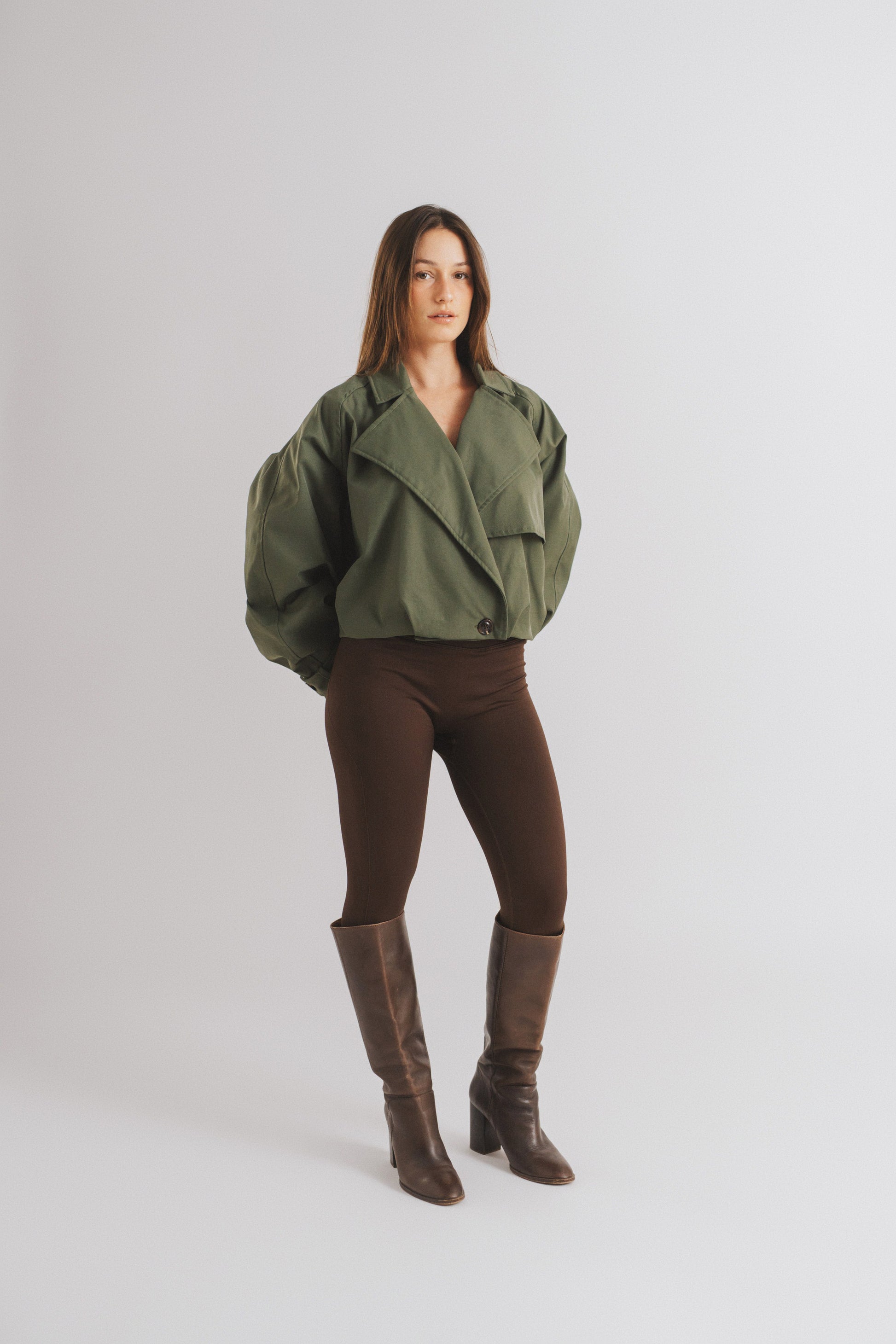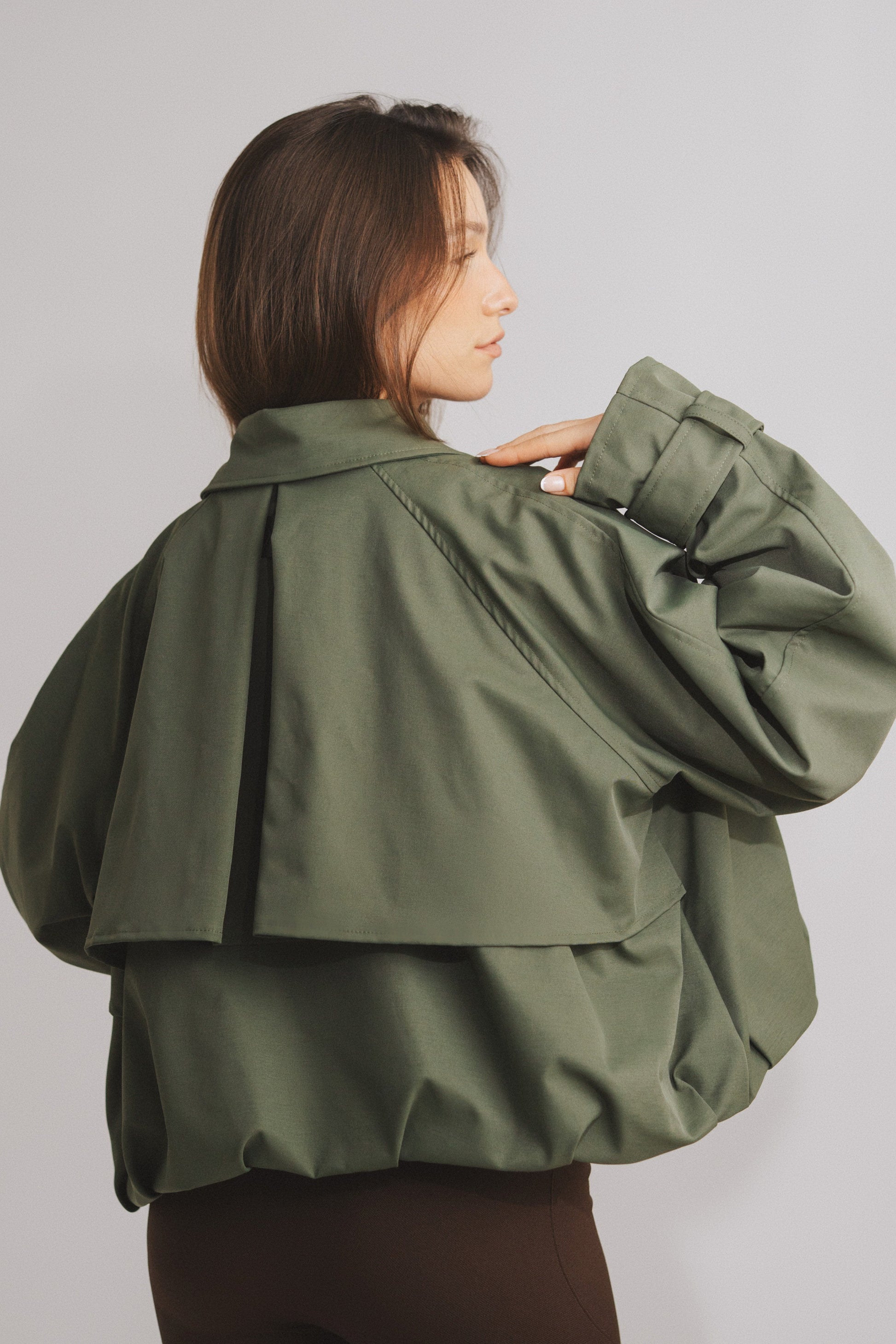 This timeless free-size olive jacket features a double-breasted design with an aside brown button closure, adding a touch of sophistication. The cropped silhouette with a bubble hem creates a modern and dynamic look. Crafted from cotton Lycra gabardine jacket. The jacket also boasts a storm flap on one side and backside, along with buttoned straps and cuffs, adding functional details.