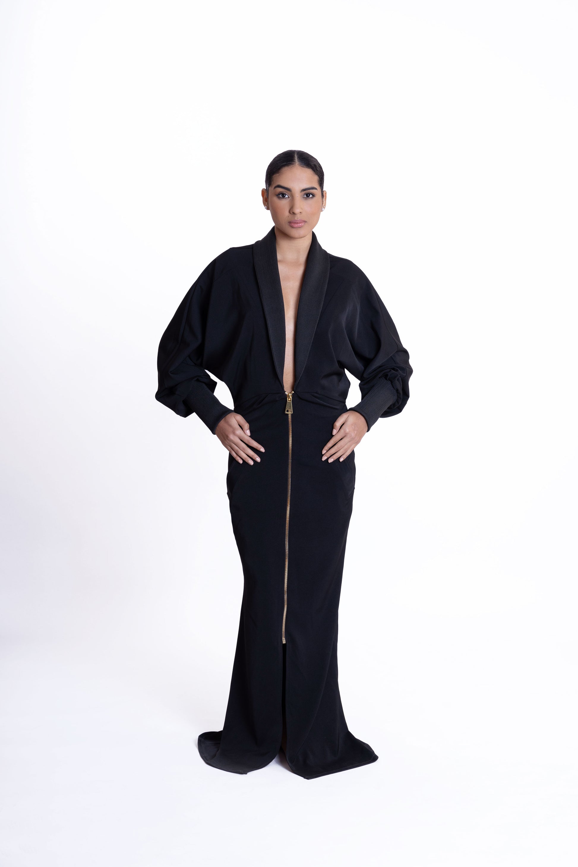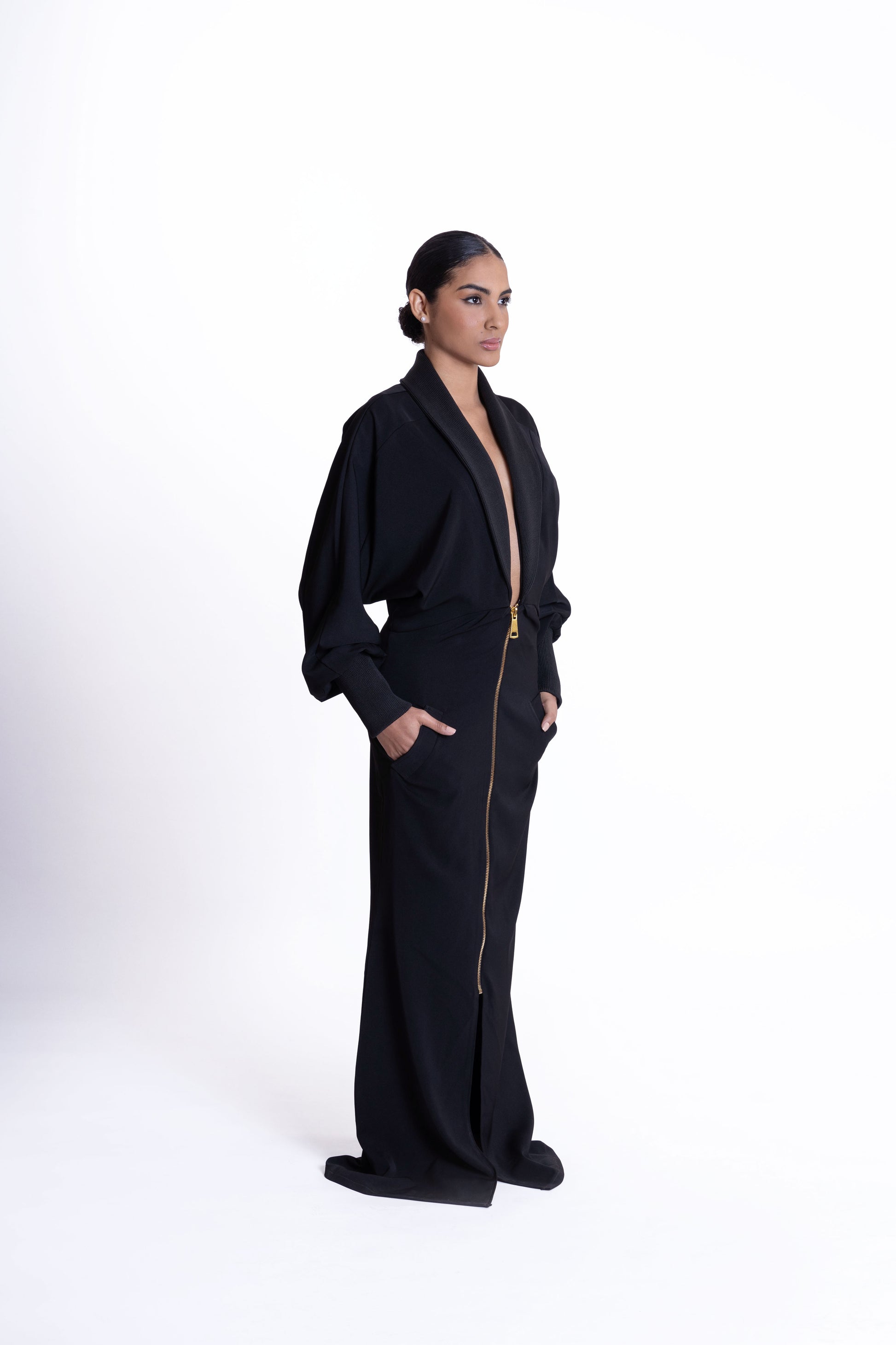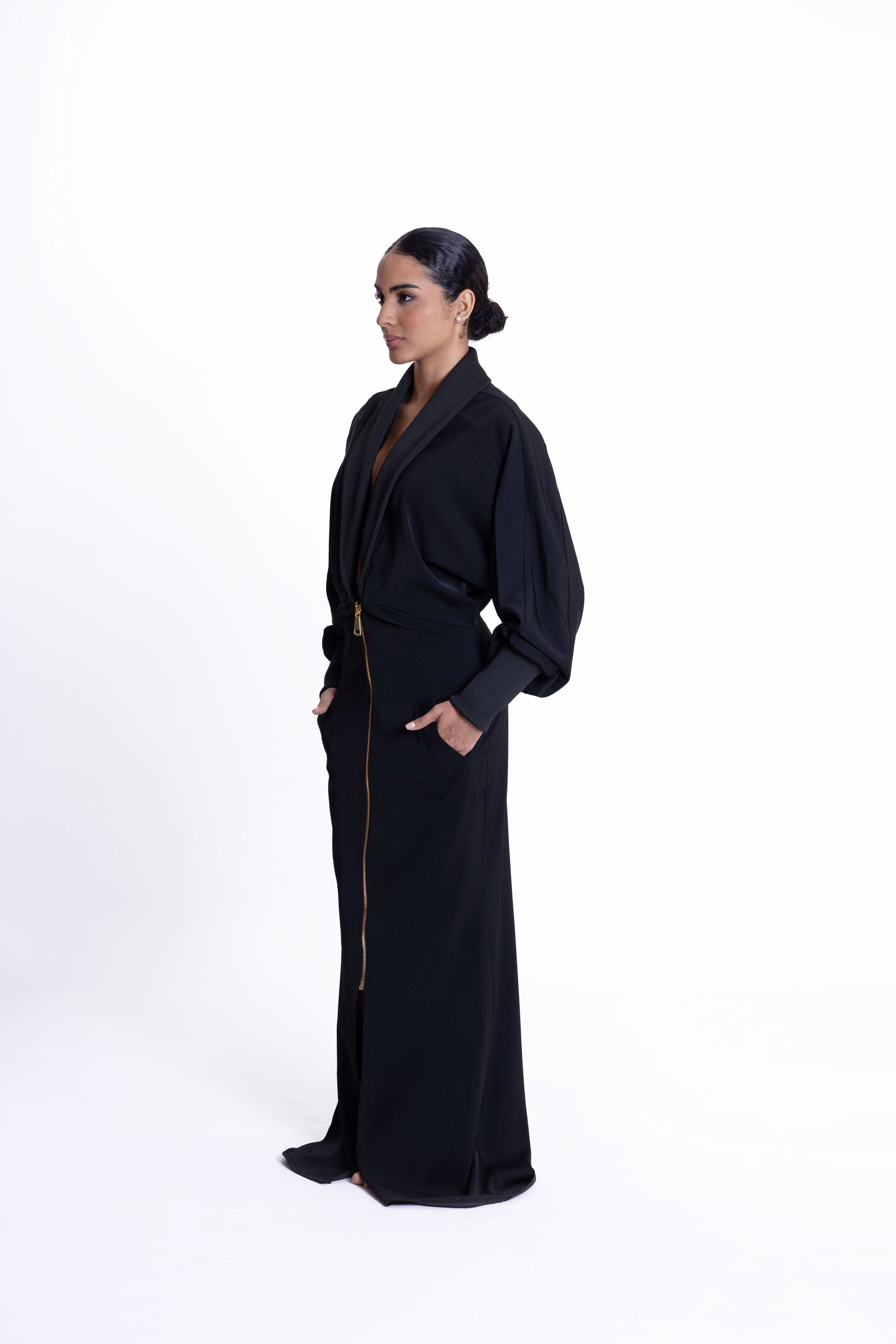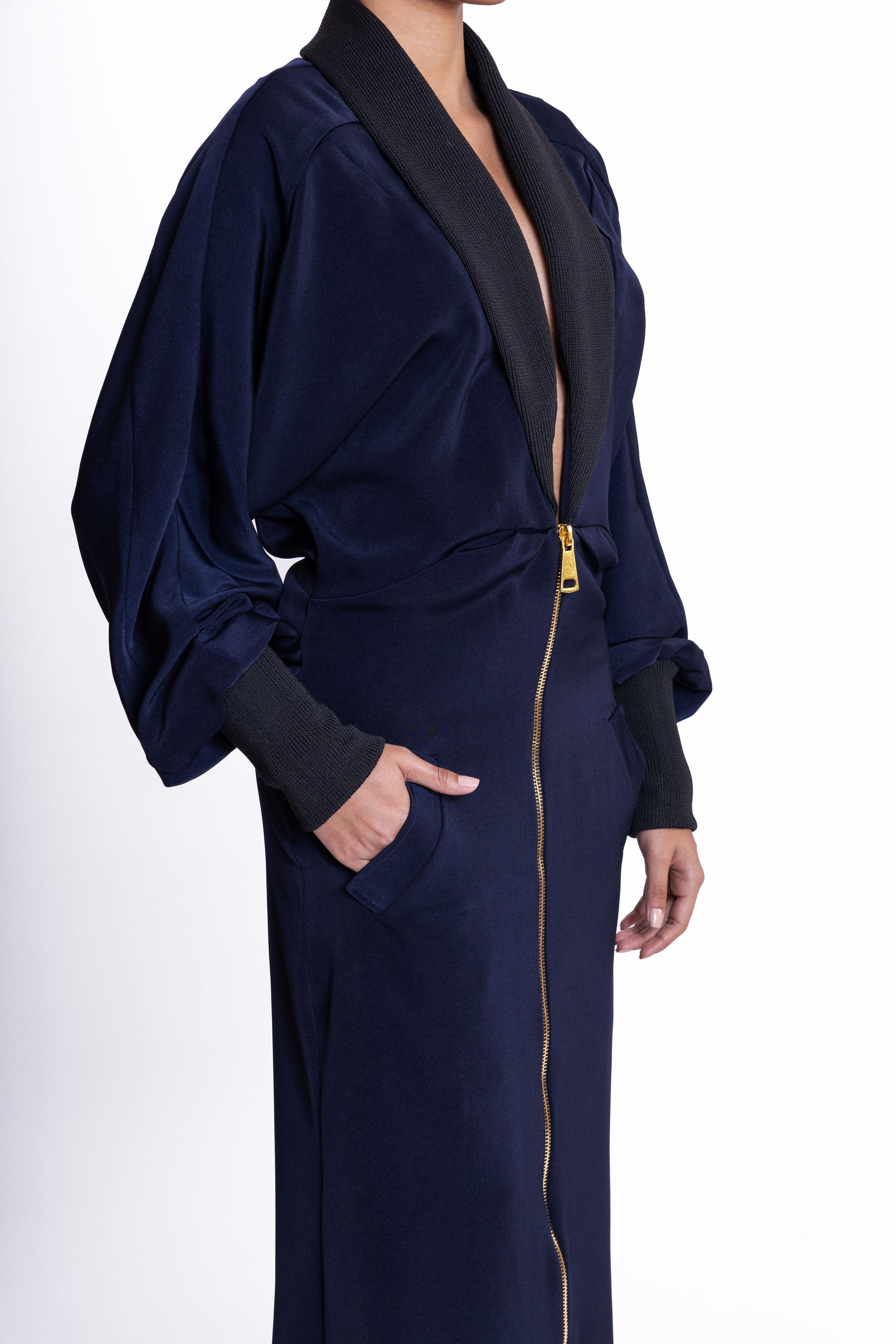 Raglan stretchy zipped maxi dress with batwing sleeve royalty and knitted jacket-style collar frames a front opening at the hem contrasting with knitted cuffs This dress features two front pockets and a front brass zipper closure ends with front slit. Fits perfectly for an effortlessly chic look. Wear with heels for a dressier finish. Dress length 150.