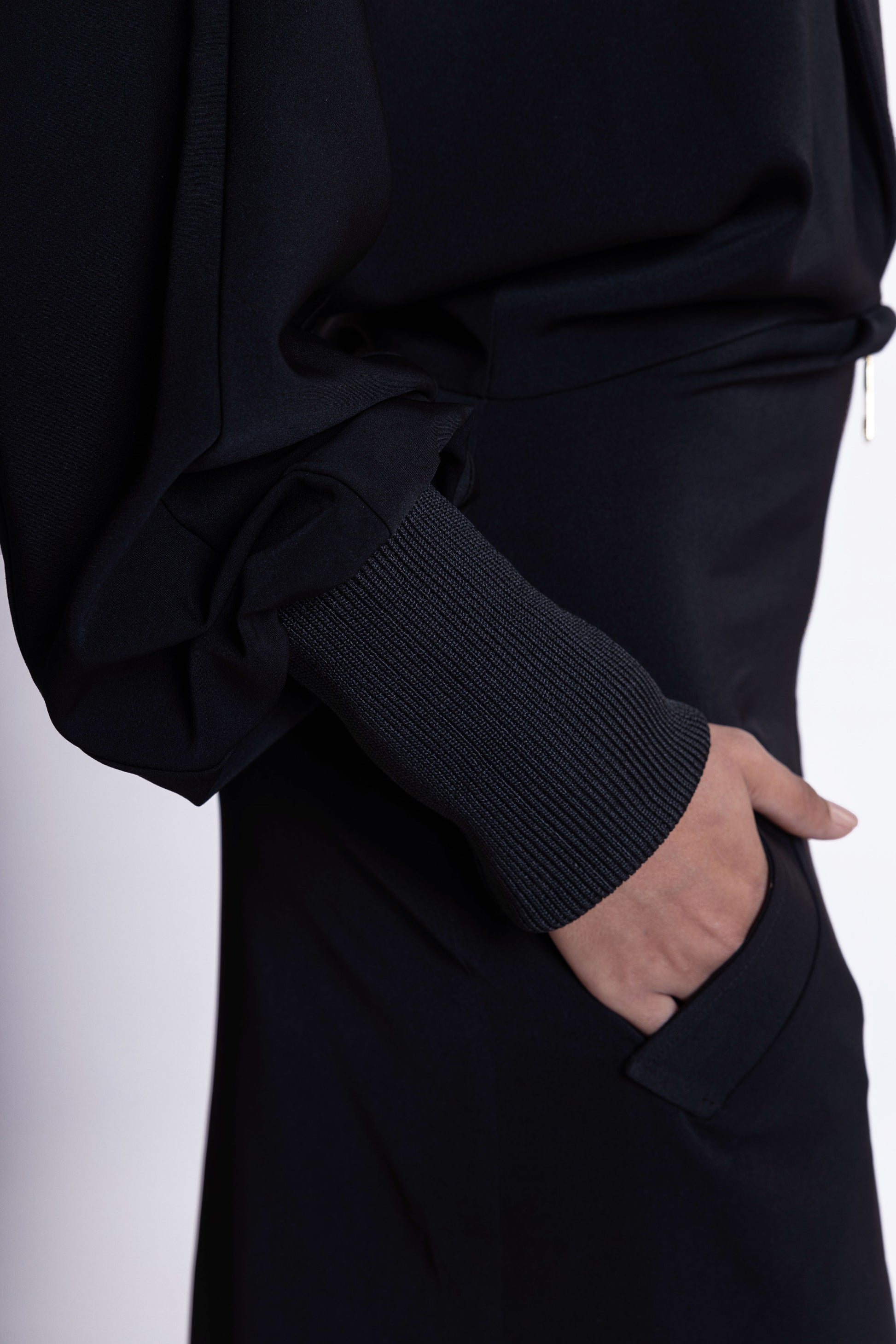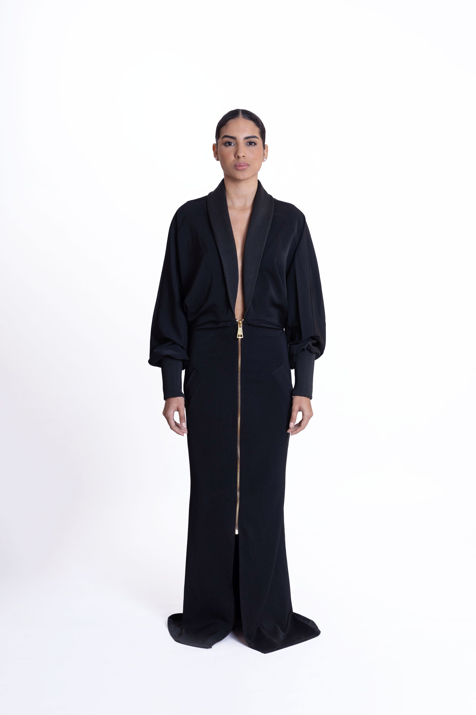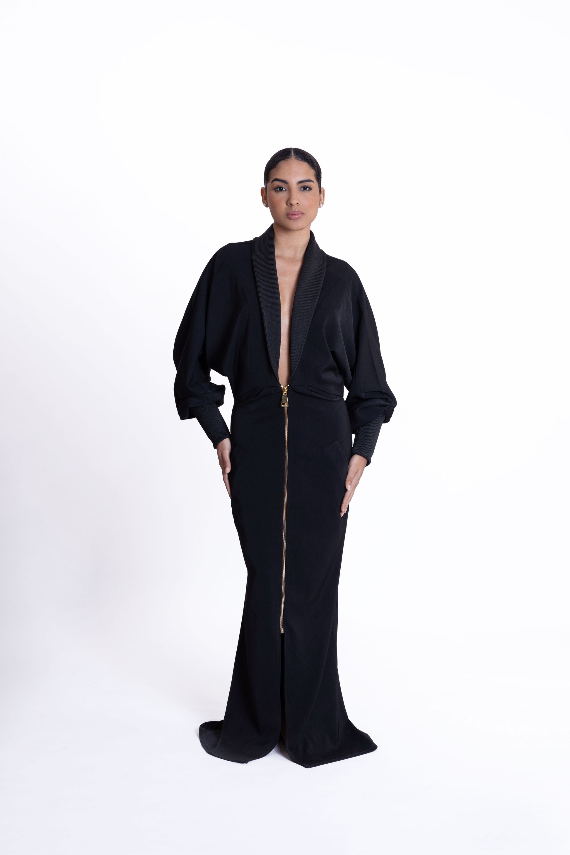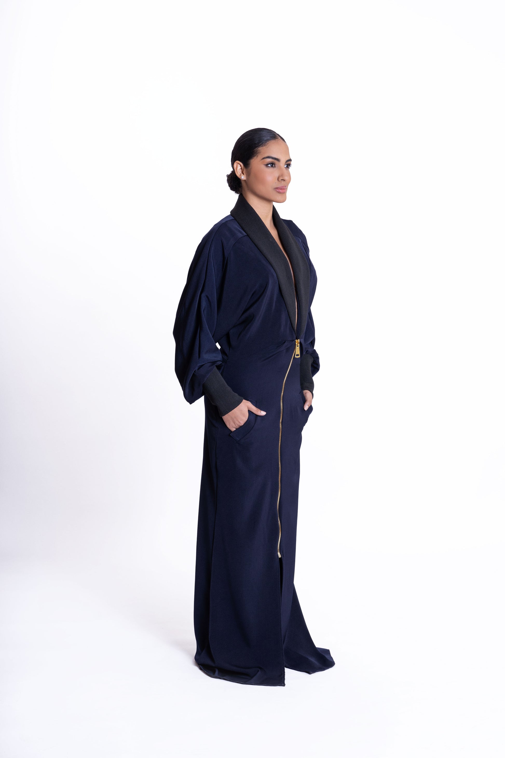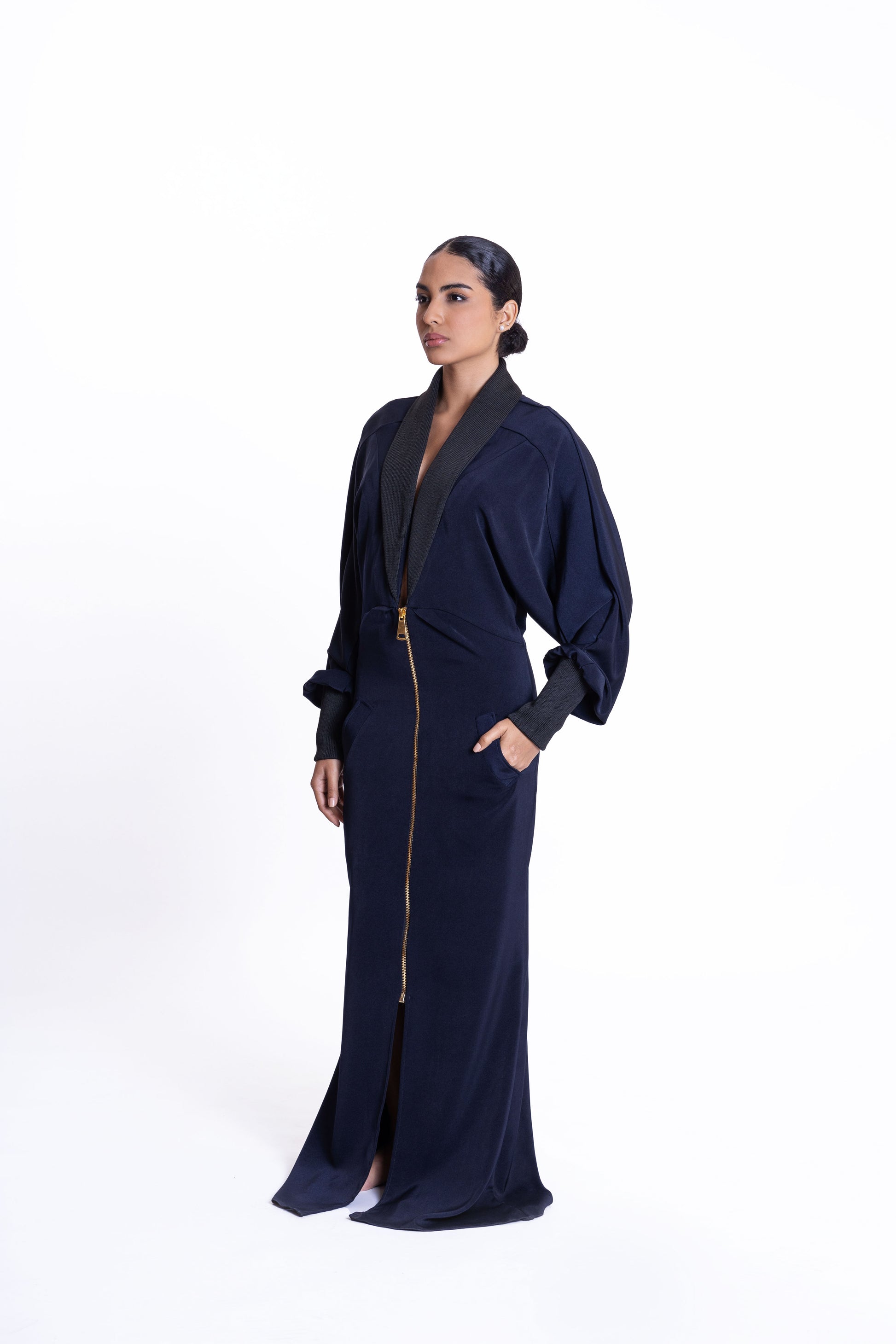 Raglan stretchy zipped maxi dress with batwing sleeve royalty and knitted jacket-style collar frames a front opening at the hem contrasting with knitted cuffs This dress features two front pockets and a front brass zipper closure ends with front slit. Fits perfectly for an effortlessly chic look. Wear with heels for a dressier finish. Dress length 150.