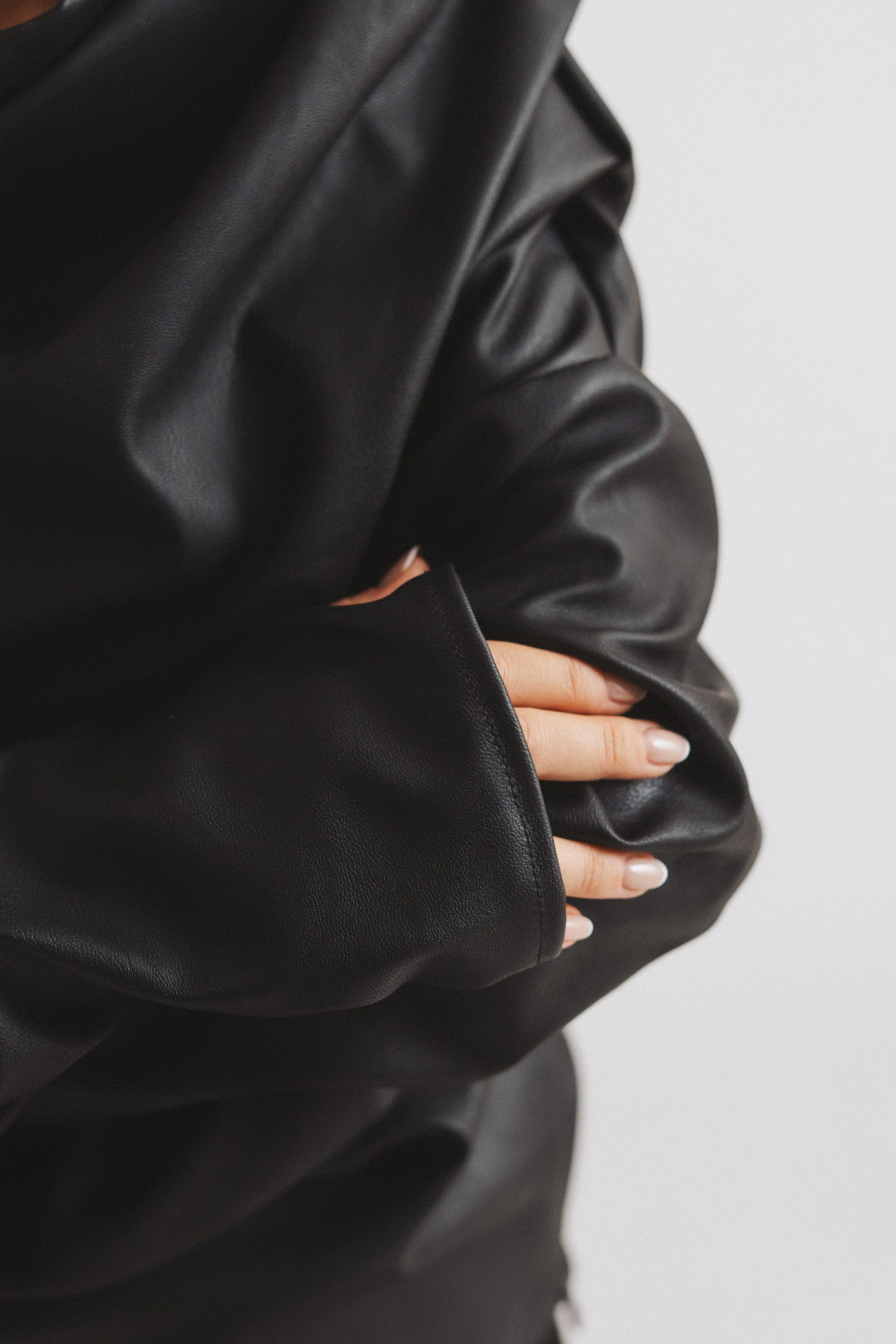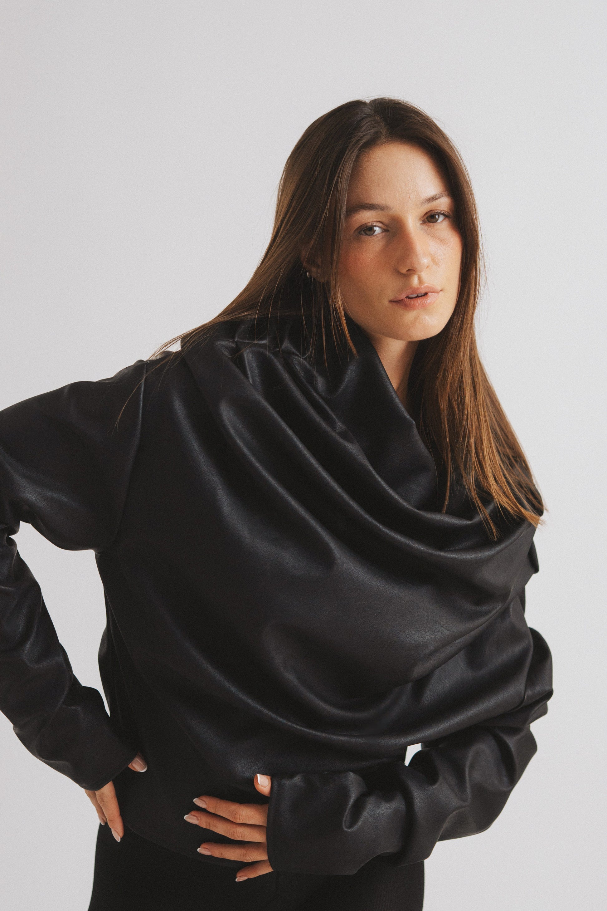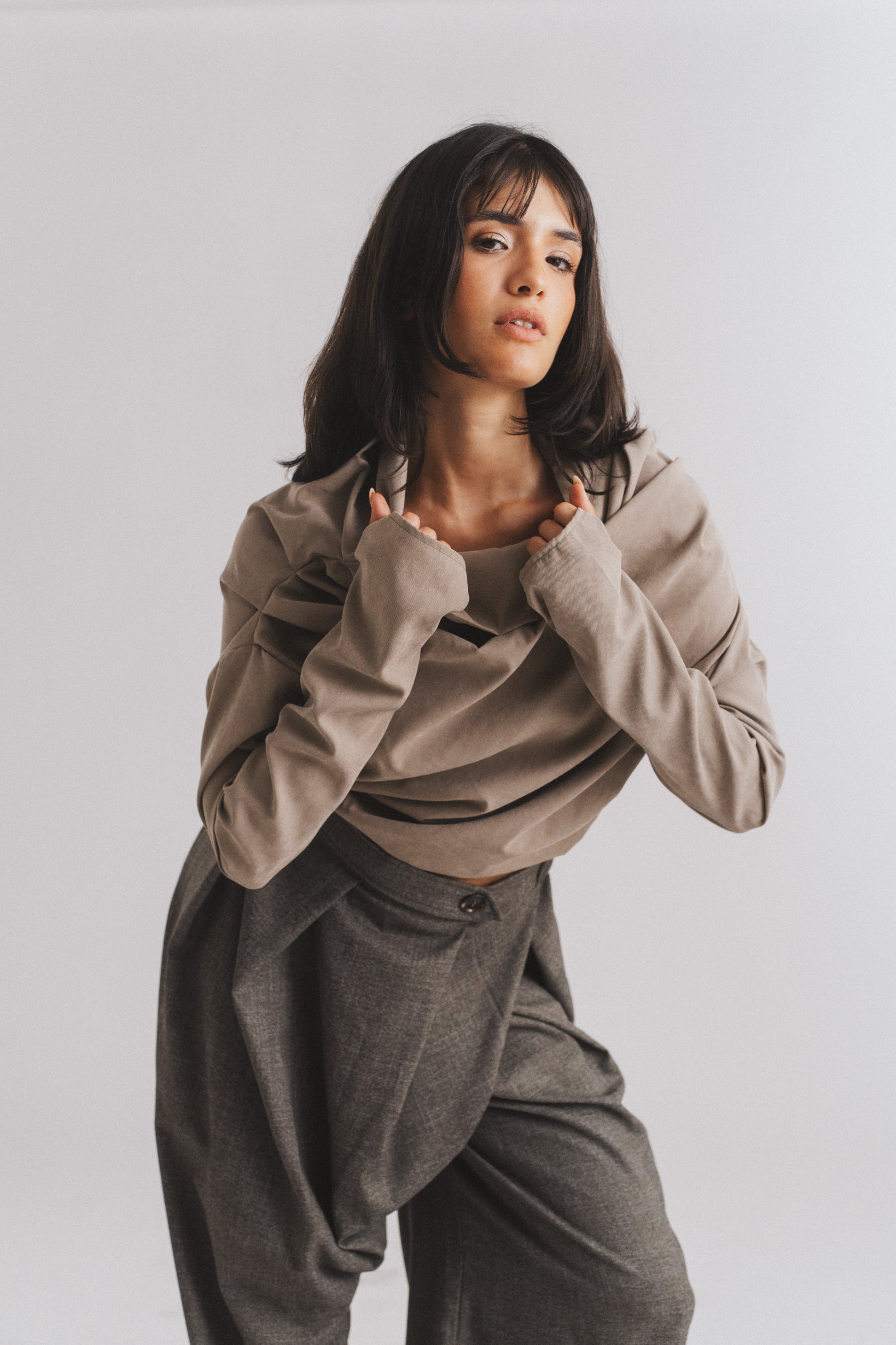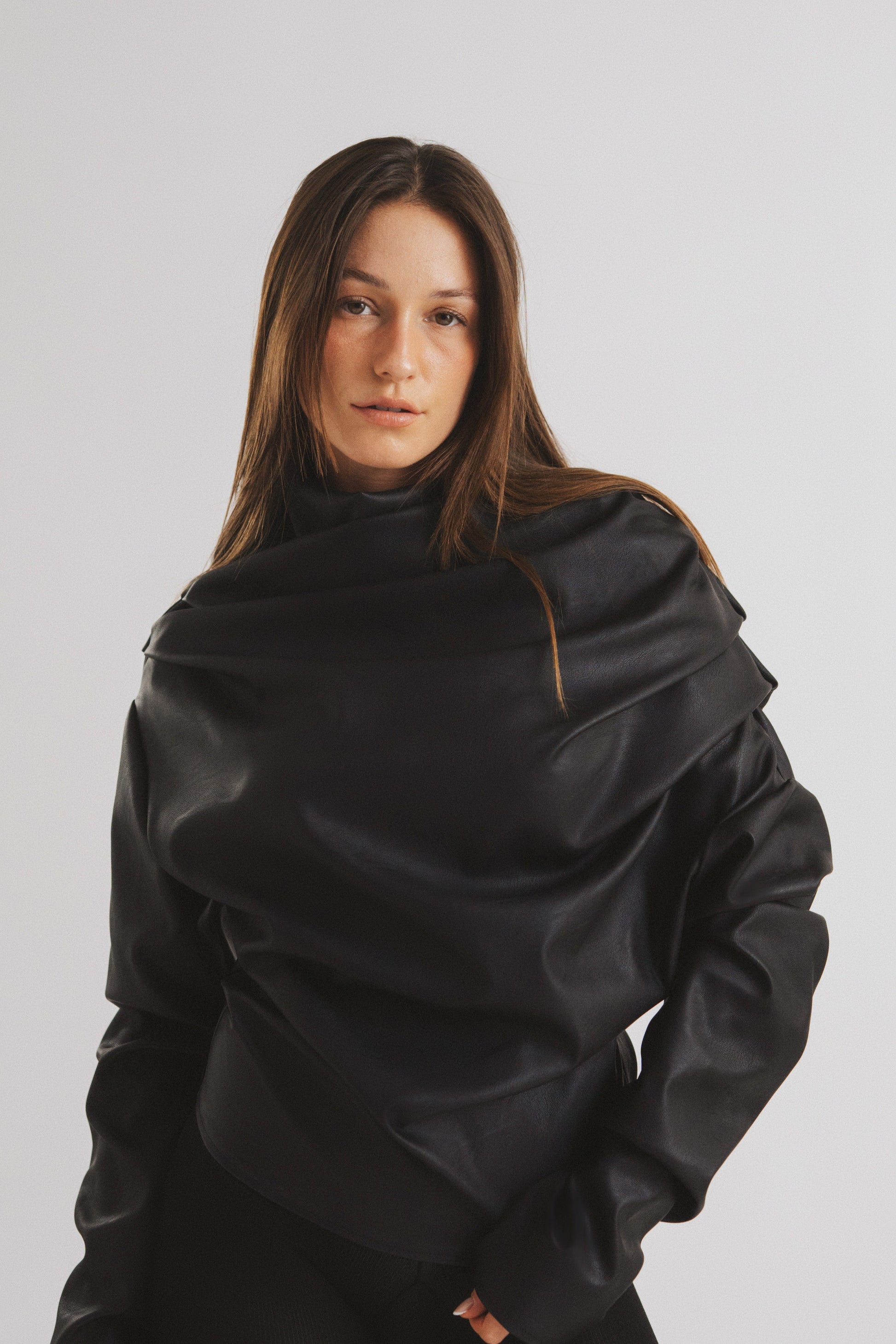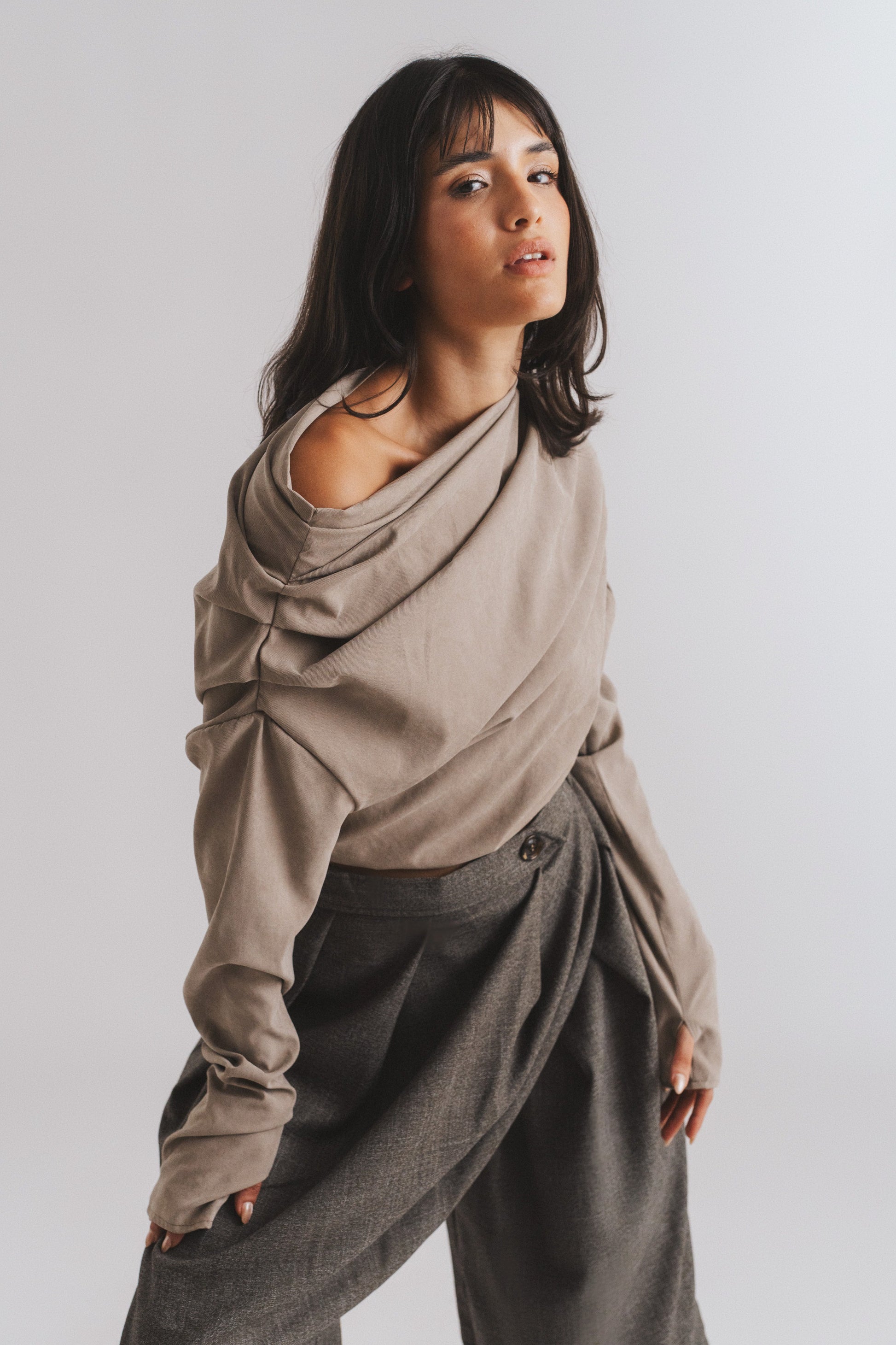 Soft luxury meets modern drama top. Asymmetrical draping and an off-shoulder design create a romantic silhouette, with drop-down long sleeves and thumbholes details. A invisible side zipper adds a touch of understated chic.