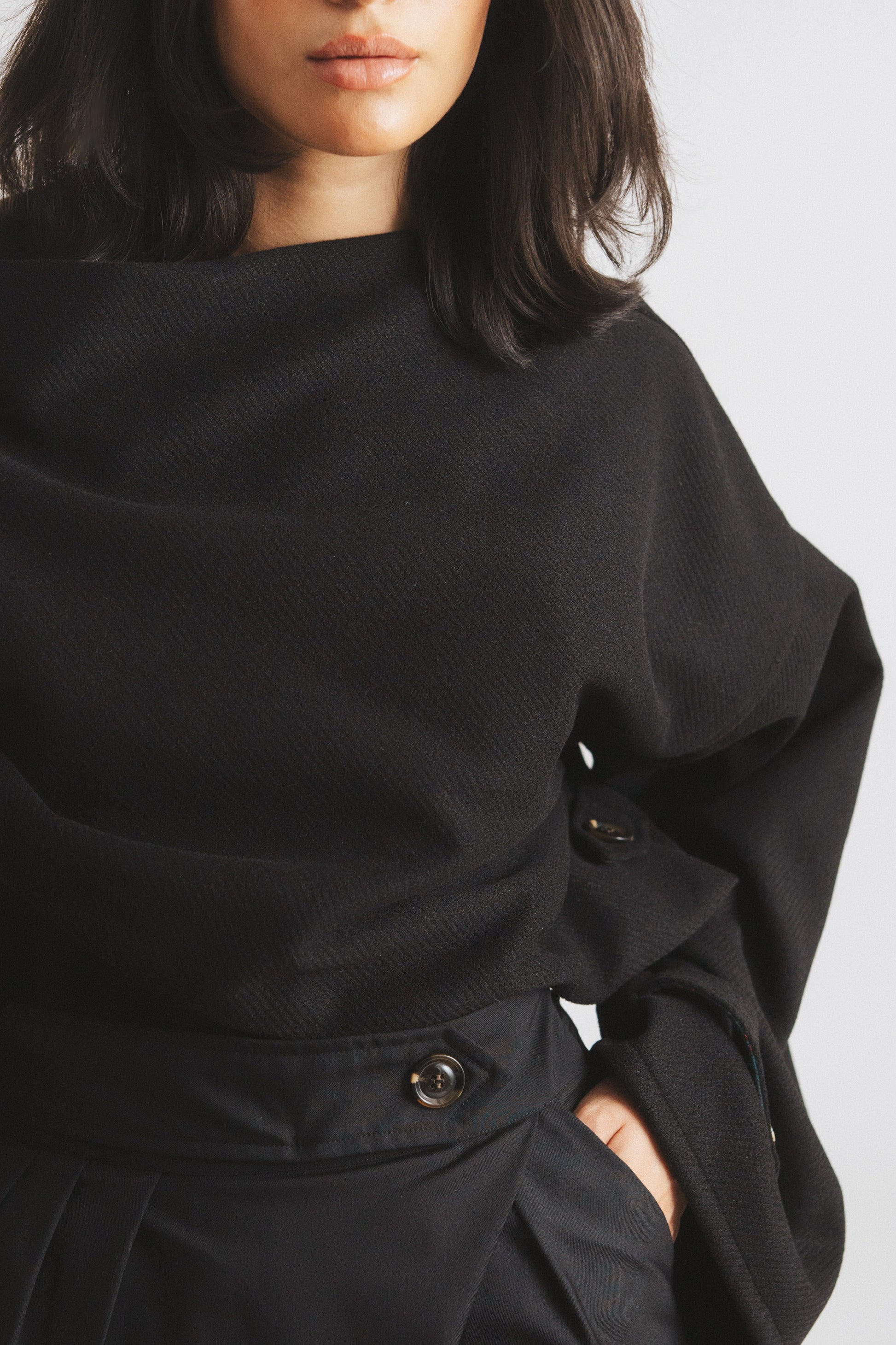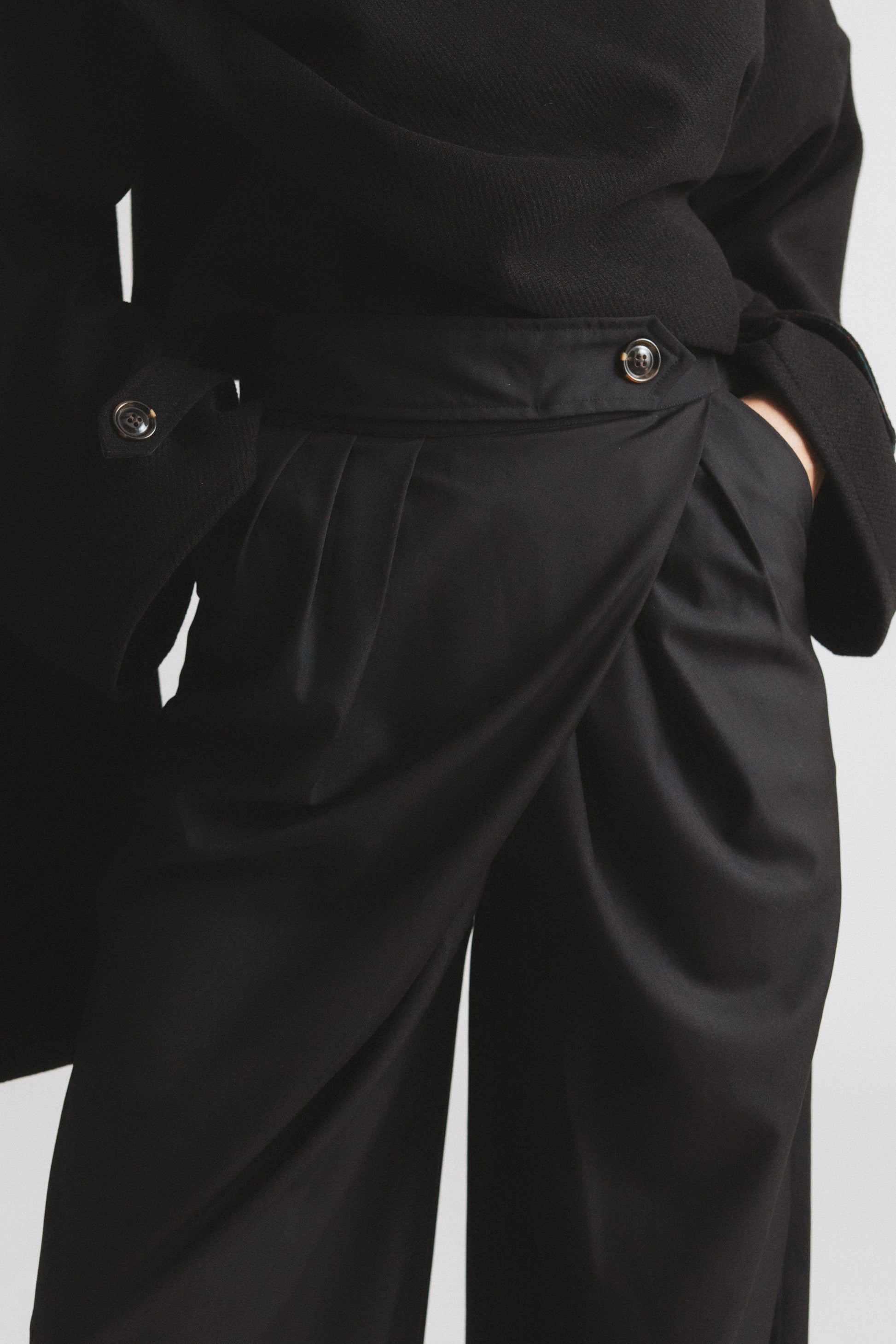 Modern drama meets refined sophistication in these woven suit pants. Crisscross draping creates a wide, relaxed fit, while a high-waisted wide strap with brown button closure adds a touch of elegance. Side pockets bring practicality, finishing the look with polished poise.