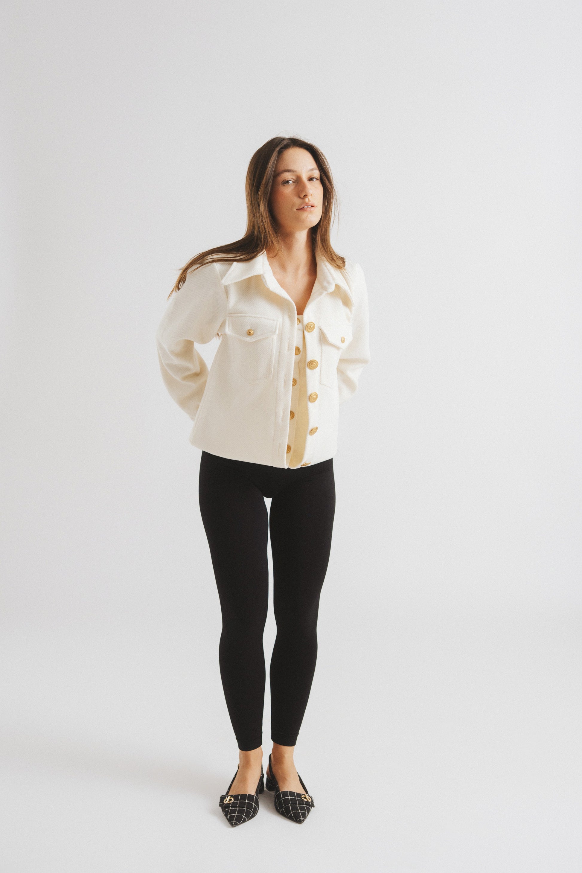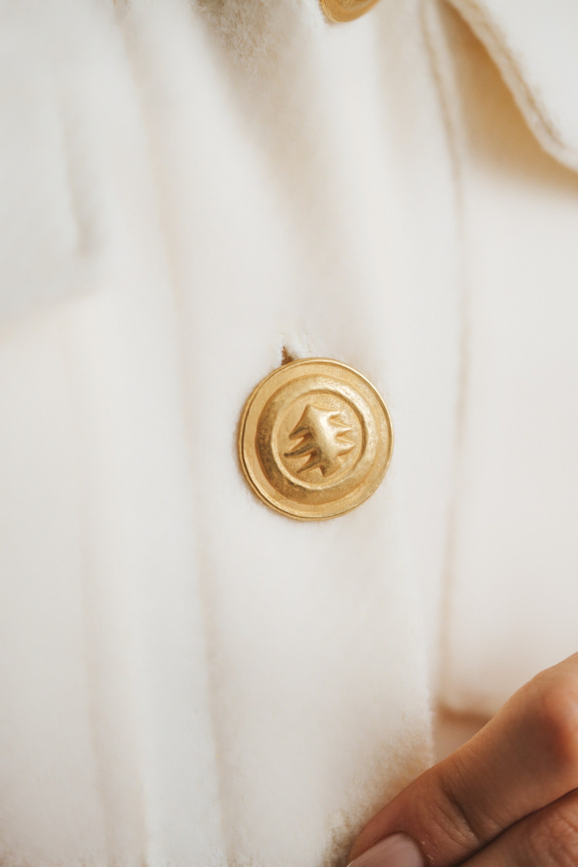 Duality meets opulence in this creme felt corset jacket, featuring a flipping design that transforms into two distinct looks. Adorned with brass buttons shaped like Chinese trees, the jacket boasts buttoned cuffs and two small, buttoned pockets. The reversible design also reveals a corset-inspired detail, adding an extra layer of sophistication.