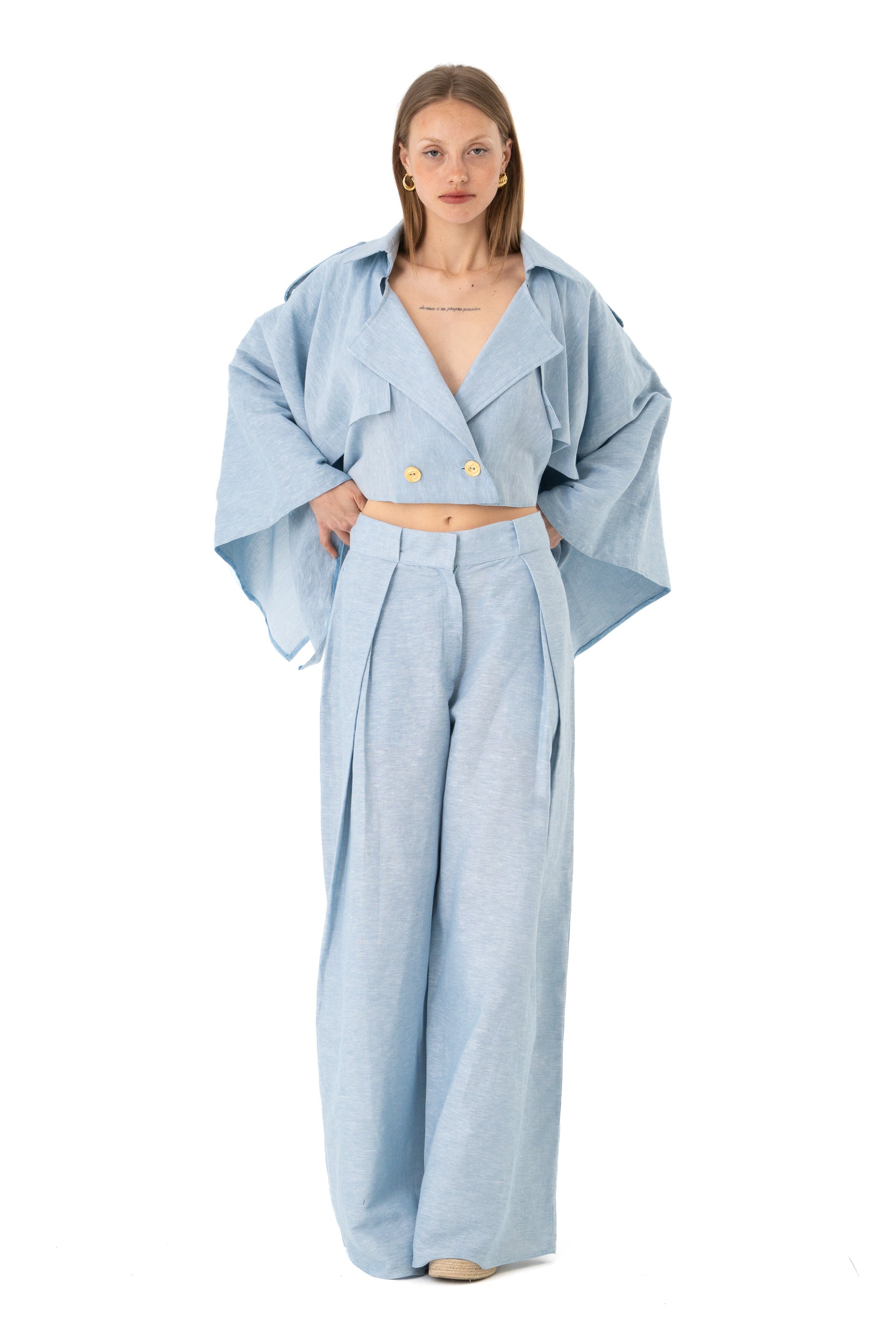 These pleated high-waisted wide leg linen pants combine style and comfort effortlessly. Crafted from breathable linen, they feature a flattering high waist that accentuates the silhouette. The wide leg design provides a relaxed fit, perfect for summer. Practical pockets add functionality, making these pants ideal for both casual outings and dressier occasions. Whether paired with a fitted top or a flowing blouse, these pants offer versatility and elegance for any wardrobe. Available in two colors.