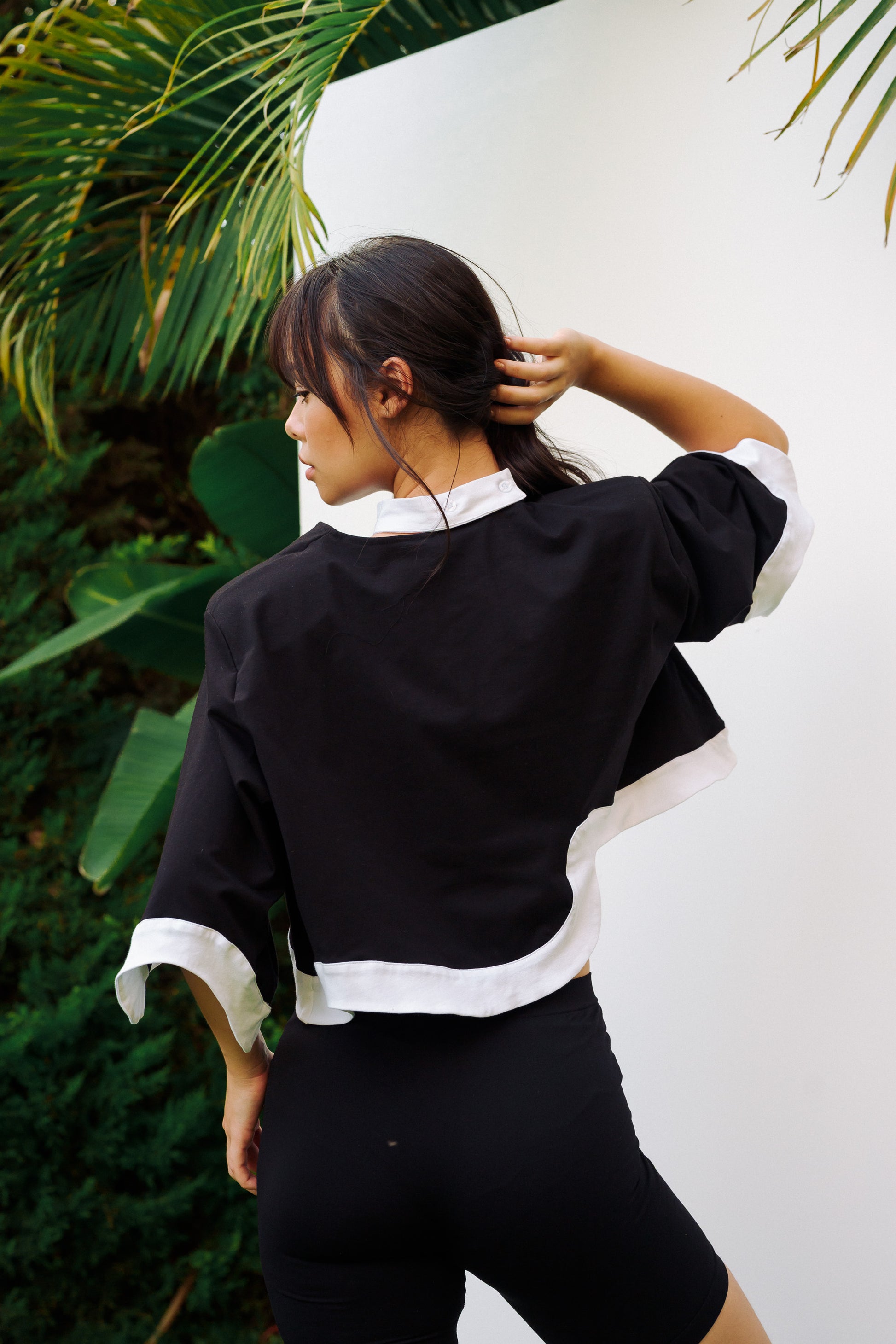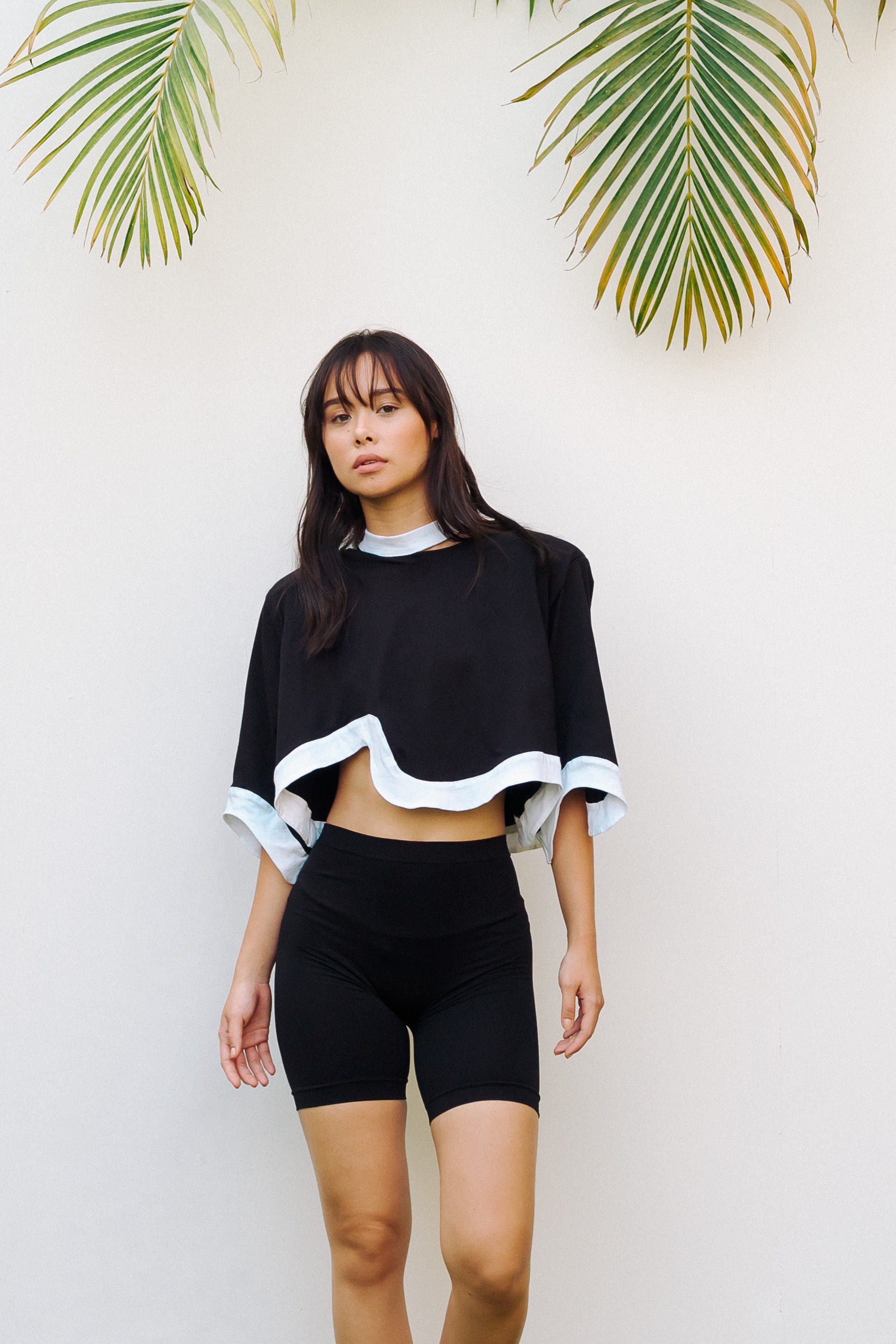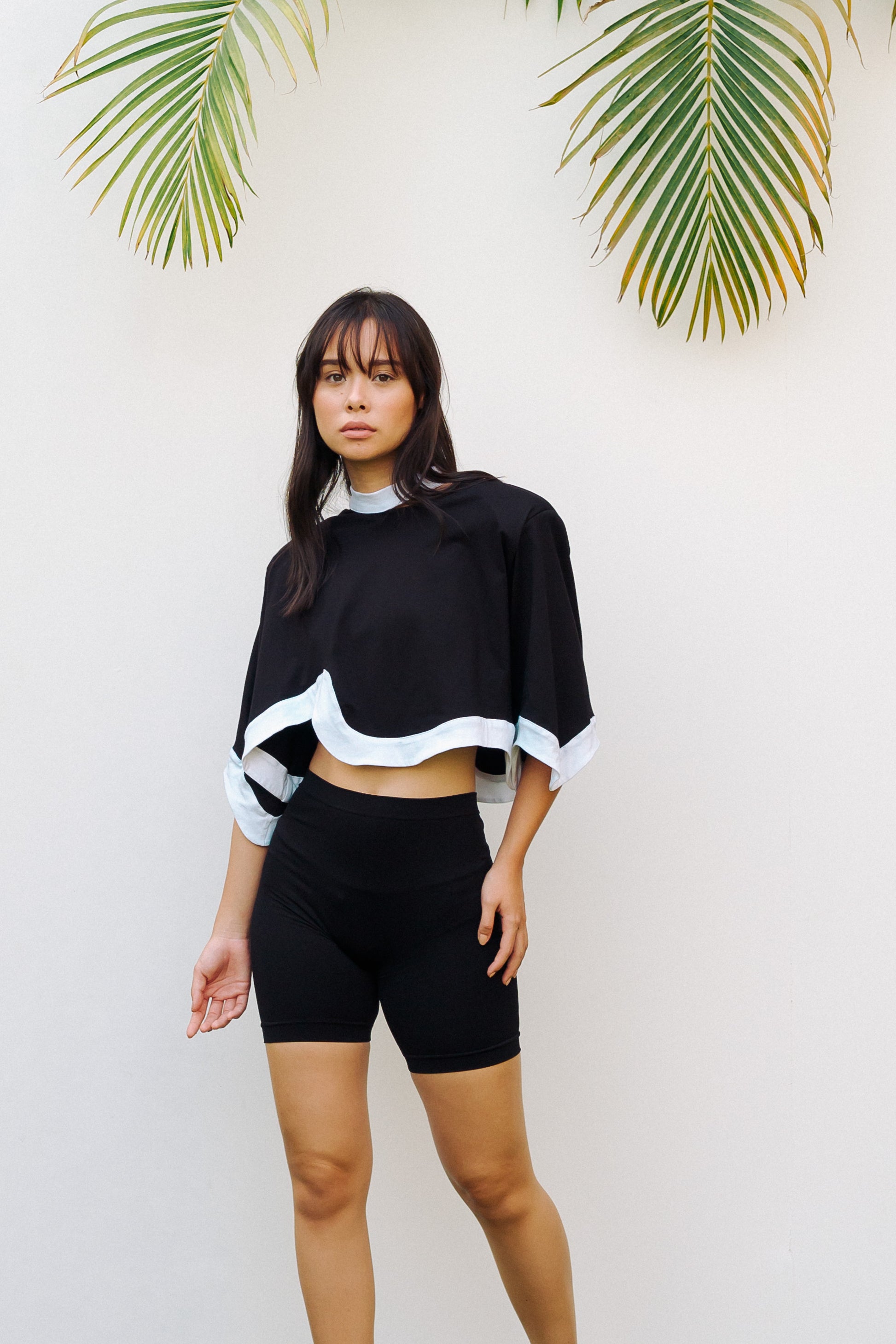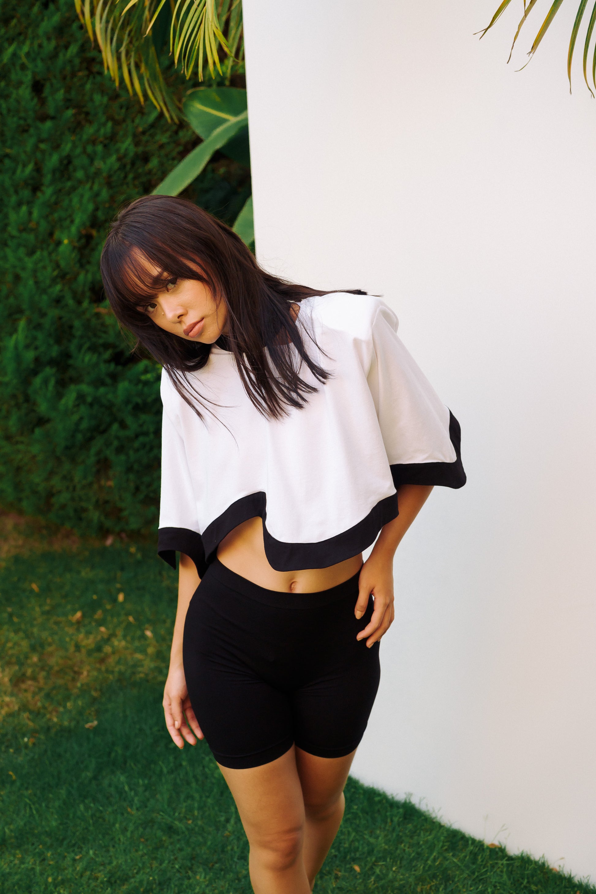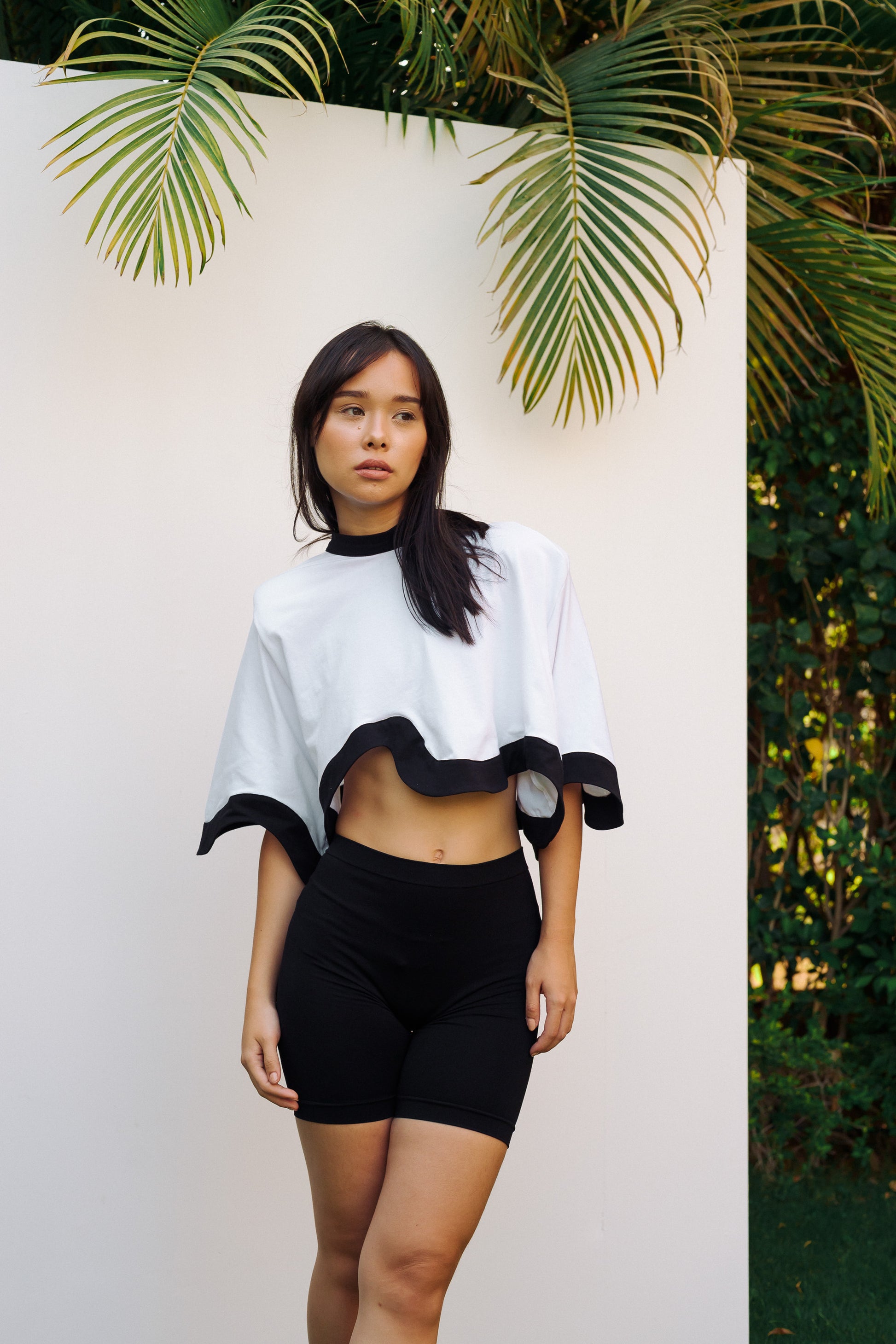 Relax in style with our oversized cotton cropped t-shirt, Featuring padded half sleeves for added comfort, this tee boasts a unique wavy hemline in different shade that adds a touch of whimsy. The buttoned cutout high collar gives a trendy, ripped vibe, perfect for a casual, edgy look.
