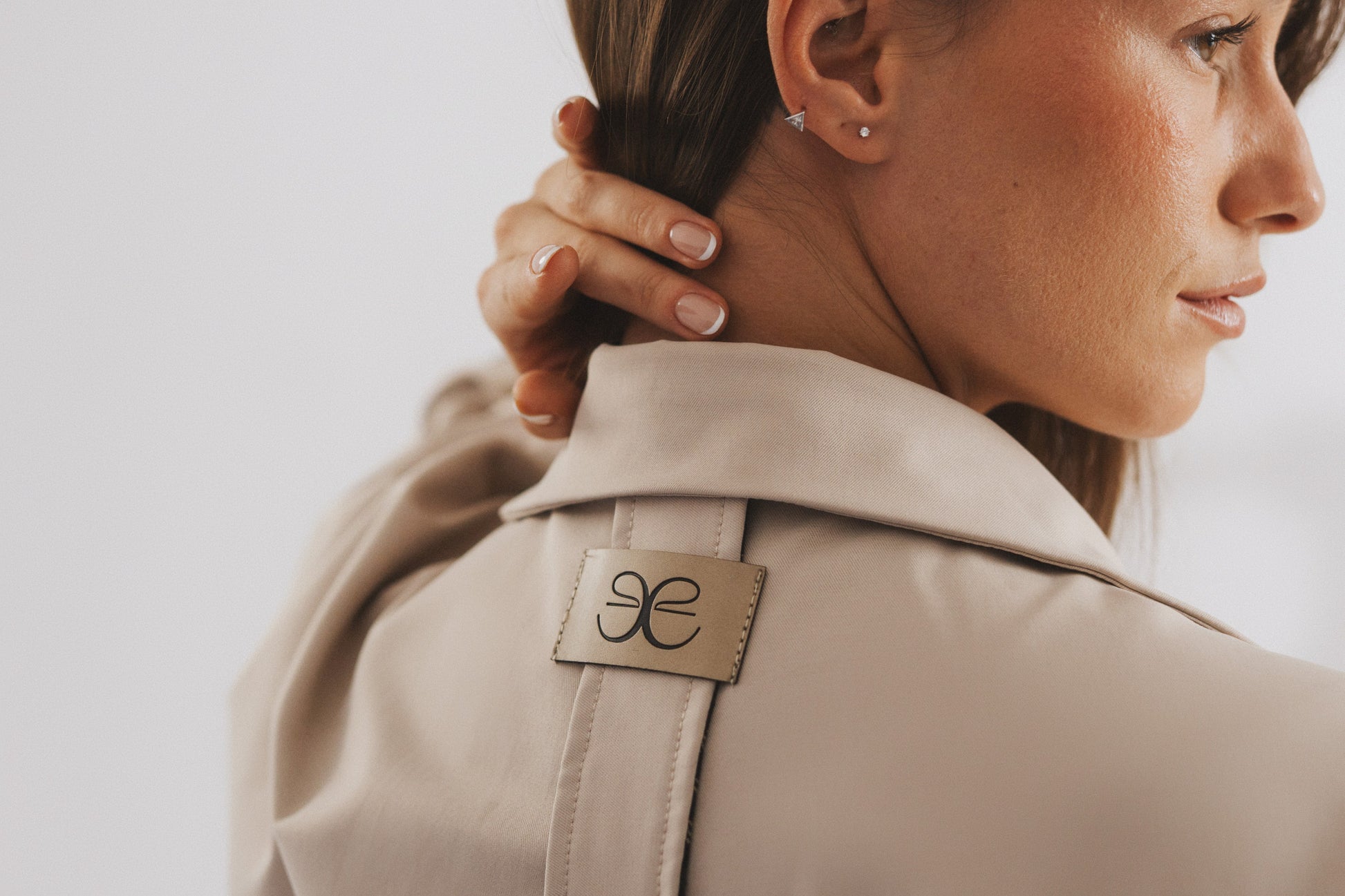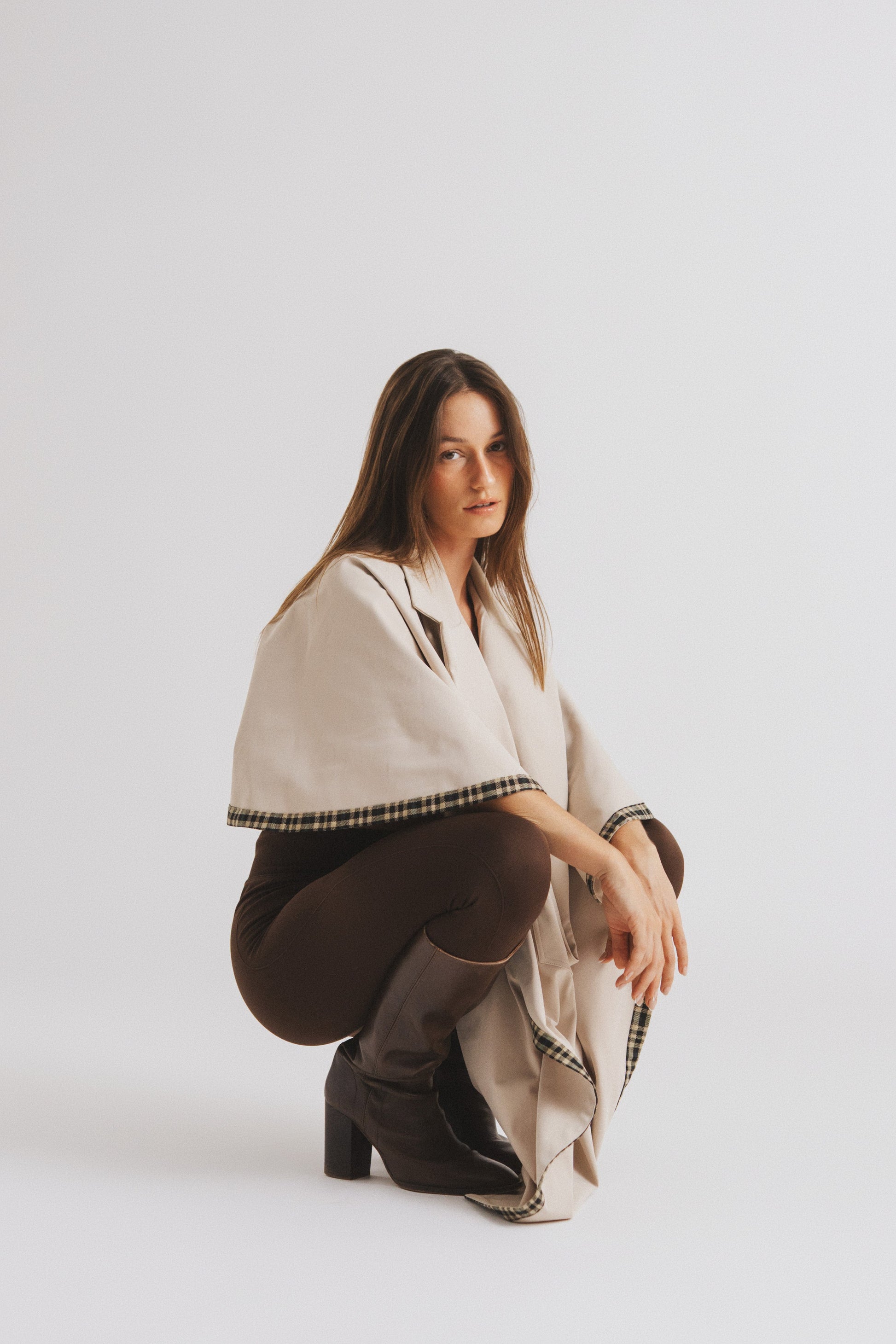 Sleek silhouette meets avant-garde flair in this free-size beige Lycra gabardine triangle batwing cape. Revered collar tips curve into rounded elegance, while side pocket adds utility. Checkered wool trim frames the cape's edges, with a dramatic front-to-back length contrast. A centered strap with fixed brown button adds a touch of sophistication.