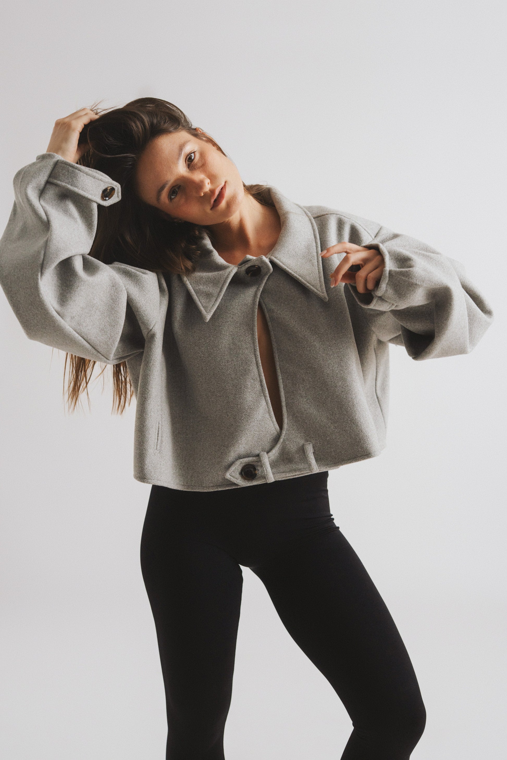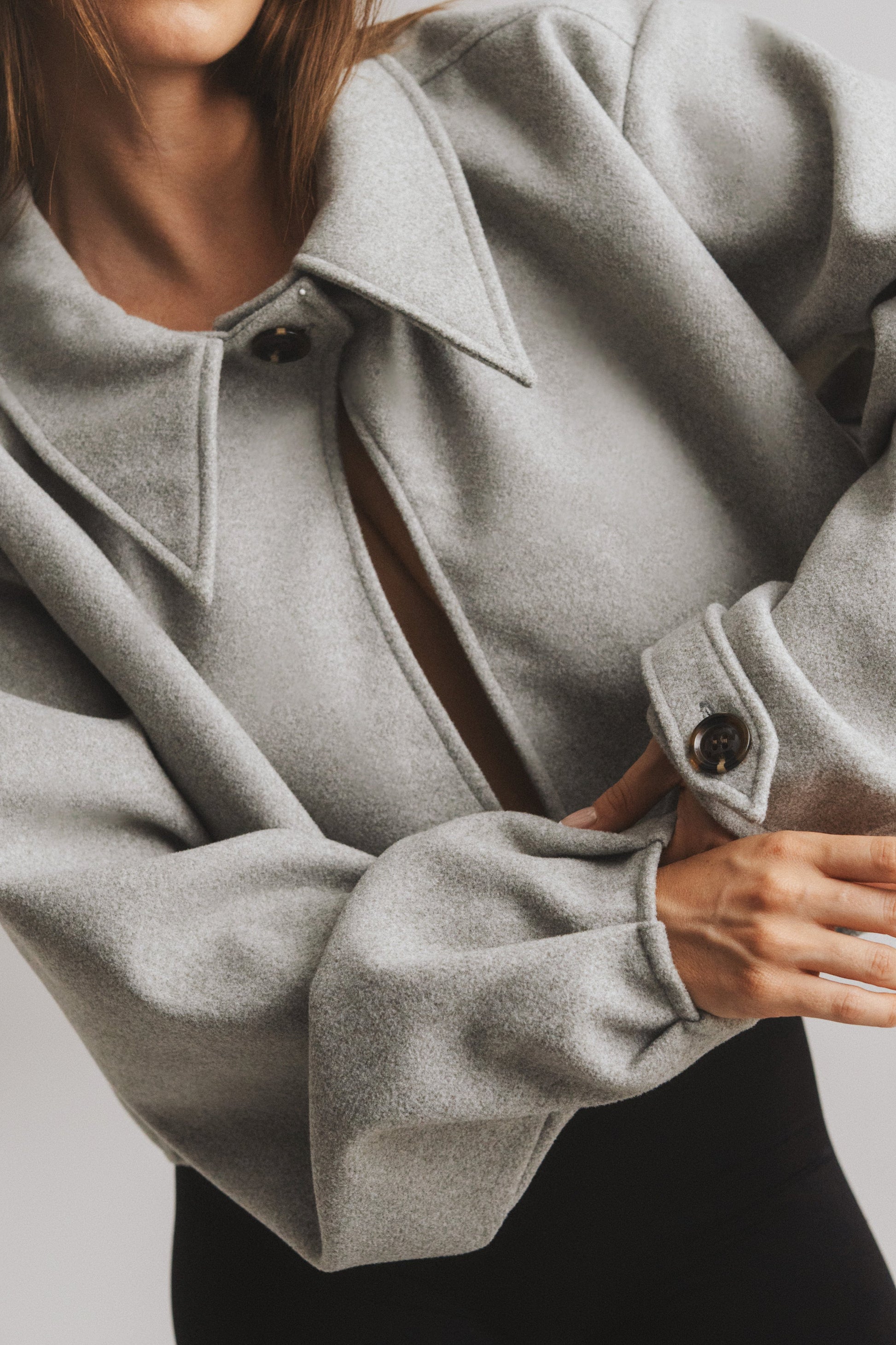 Effortless sophistication meets modern nuance in this light grey felt jacket. A chemise collar adds a touch of refinement, while crisscross detailing creates a striking silhouette. Dual brown buttons secure the neckline and waistline, complemented by buttoned strap cuffs that add a polished finish.